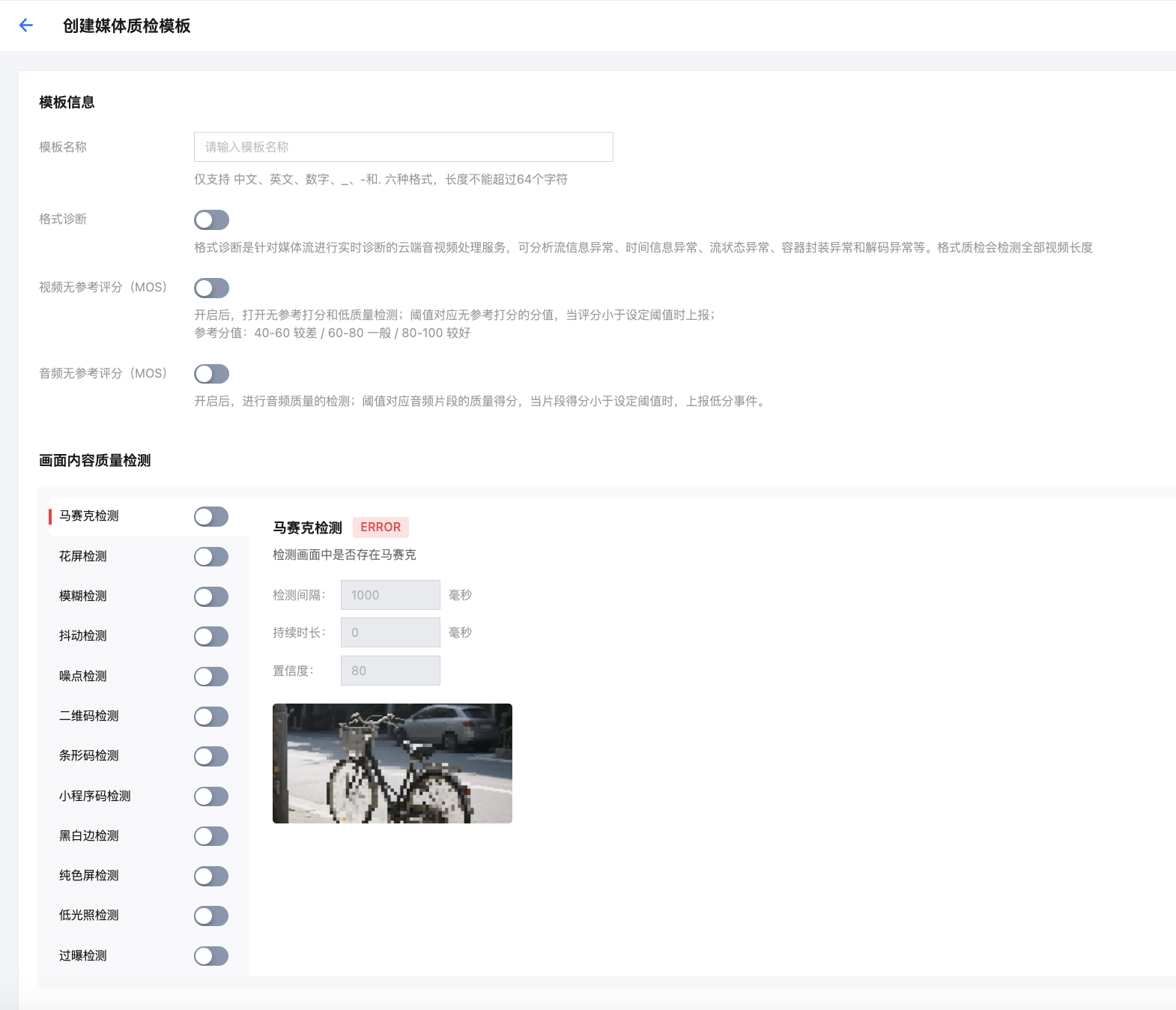 画面质量问题 | 马赛克检测 | 检测画面中是否存在马赛克。当检测出的置信度大于等于设定值时上报。 置信度取值范围 [0,100]; 检测间隔单位是毫秒(ms),取值需大于500ms; 持续时间范围 0-600000ms。 |
