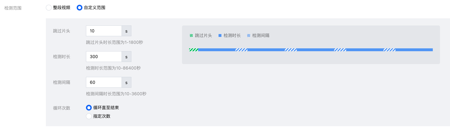 声音检测 | 静音检测 | 检测音频是否存在静音的情况。 阈值取值范围不可编辑; 检测间隔单位是毫秒(ms),取值需大于0ms; 持续时间范围 0-600000ms。 |