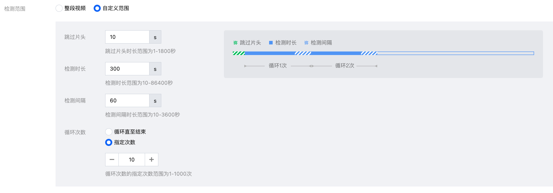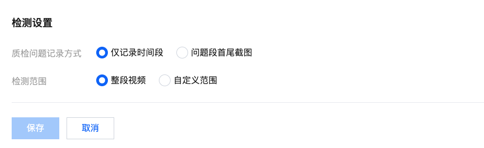 | 爆音检测 | 检测音频是否存在音量过高片段。当音频分贝高于设定值时上报。 响度取值范围 [70,96]; 检测间隔单位是毫秒(ms),取值需大于0ms; 持续时间范围 0-600000ms。 |