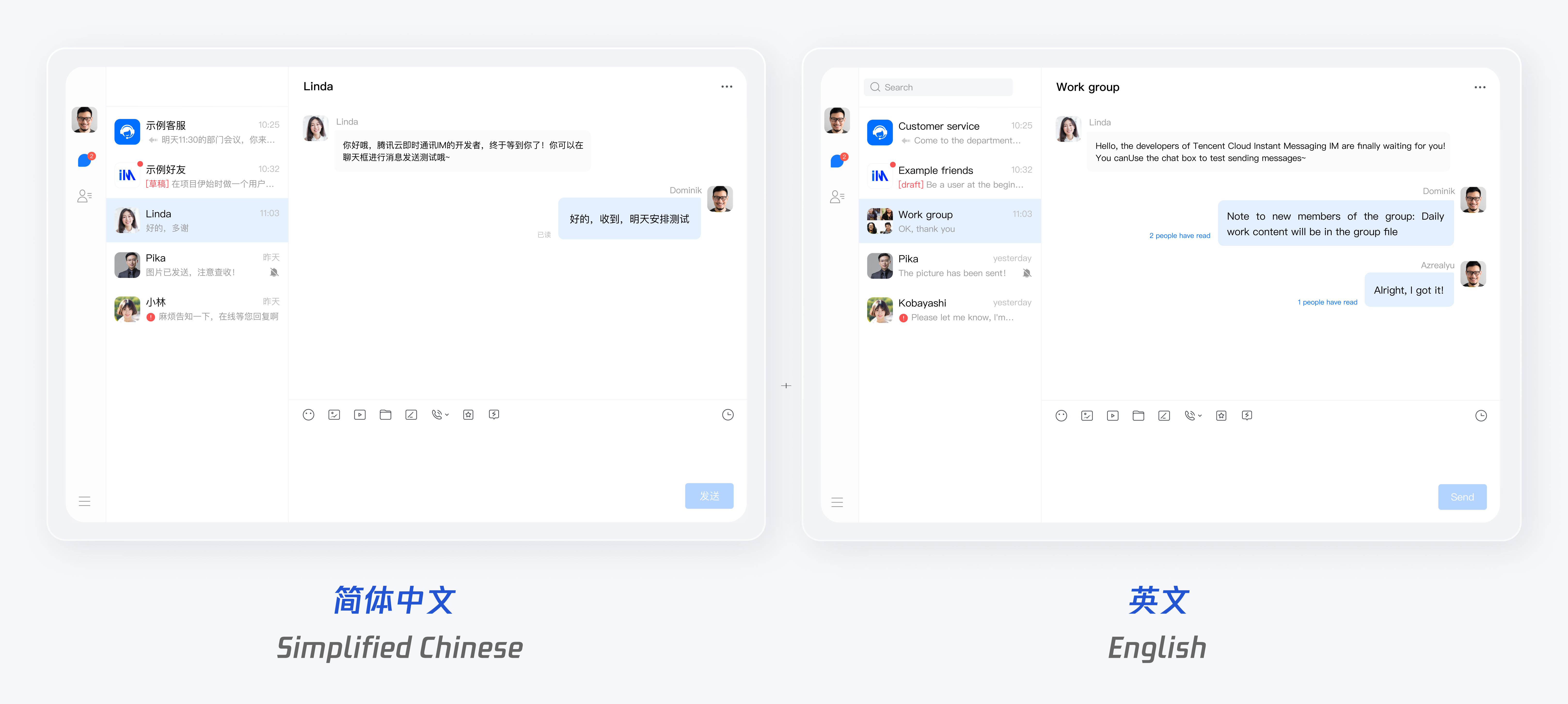 Vue TUIKit 默认自带 简体中文、英语 语言包,作为界面展示语言。