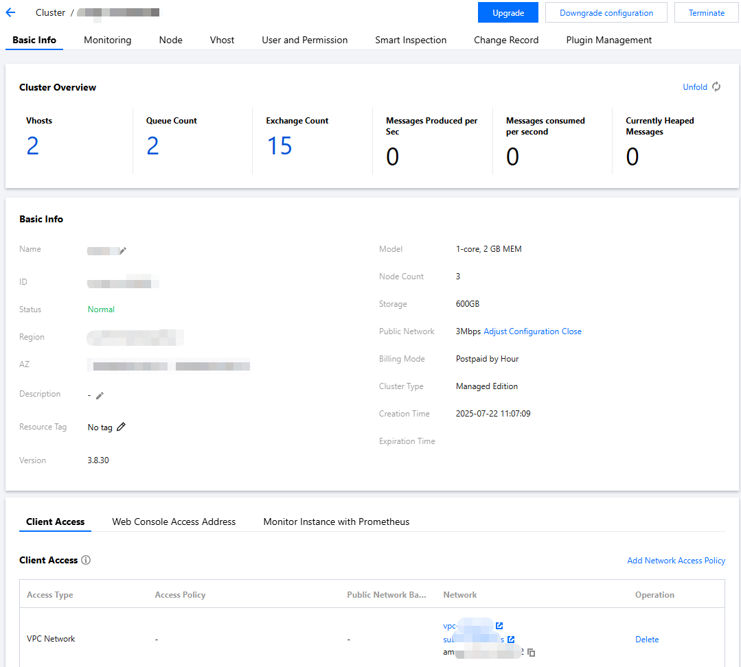 Web console access address | Open-source Managed Edition | Display the access address and username/password info of the open-source RabbitMQ console. It supports both public network and private network access. Public network access supports allowlist control. |