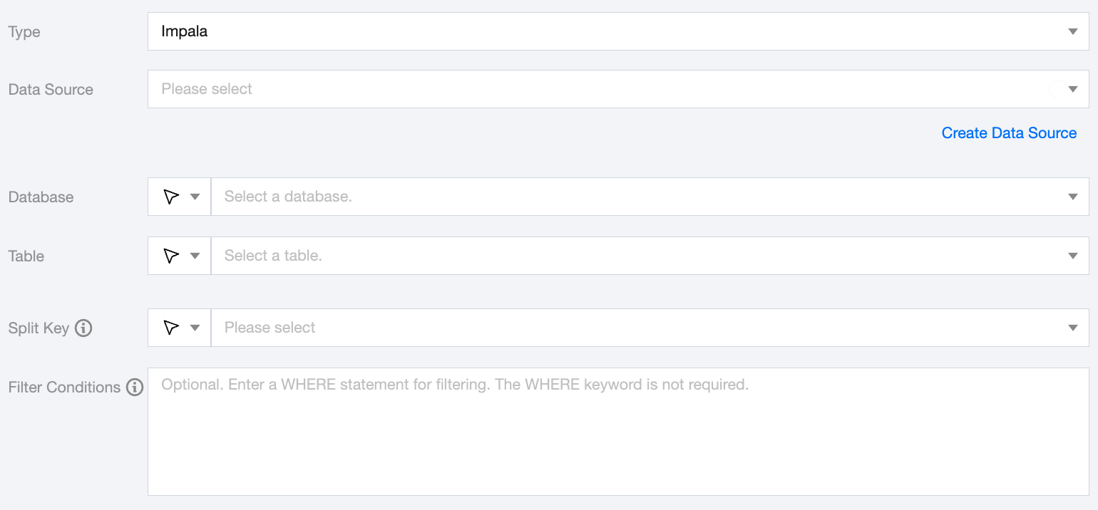Table | Supports selecting or manually entering the table name to be read. If the data source network is not connected and table information cannot be fetched directly, you can manually enter the table name. Data synchronization can still be performed when the Data Integration network is connected. |