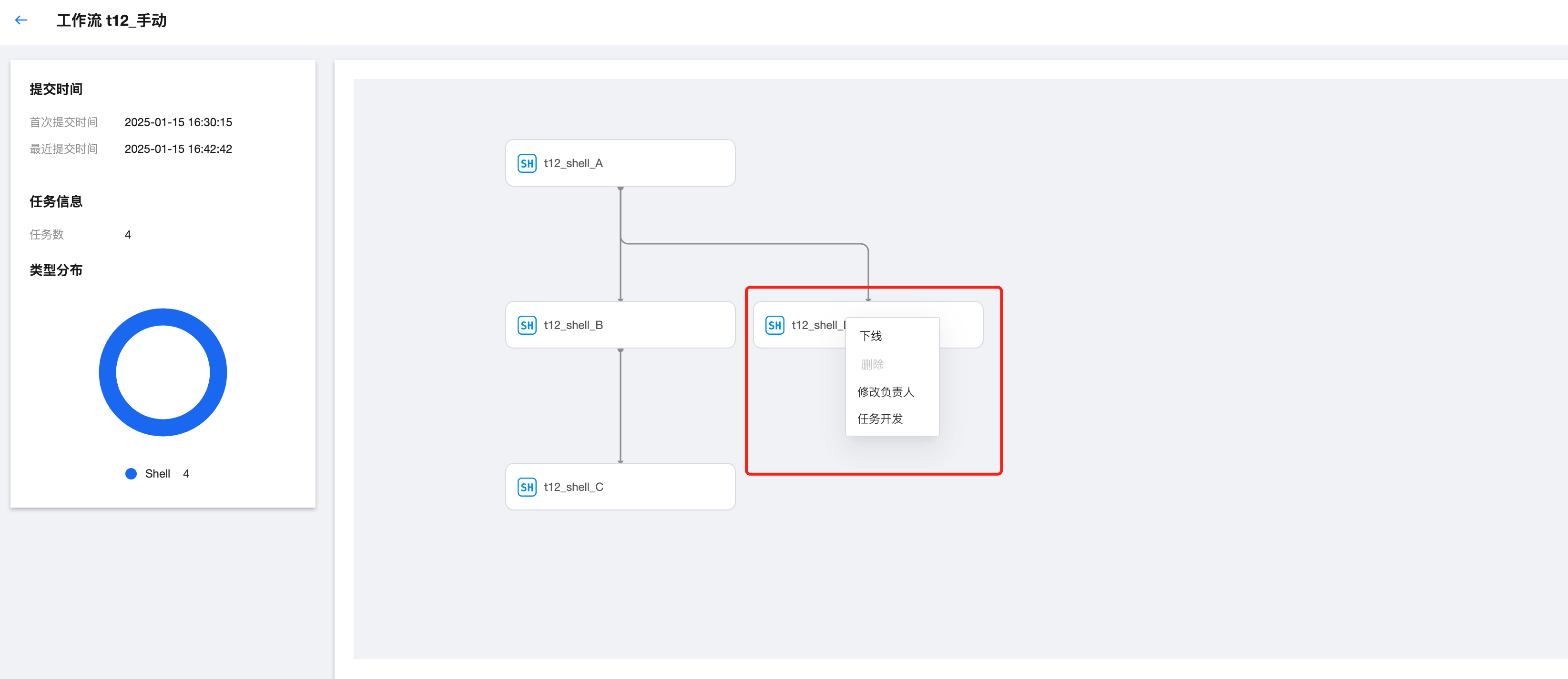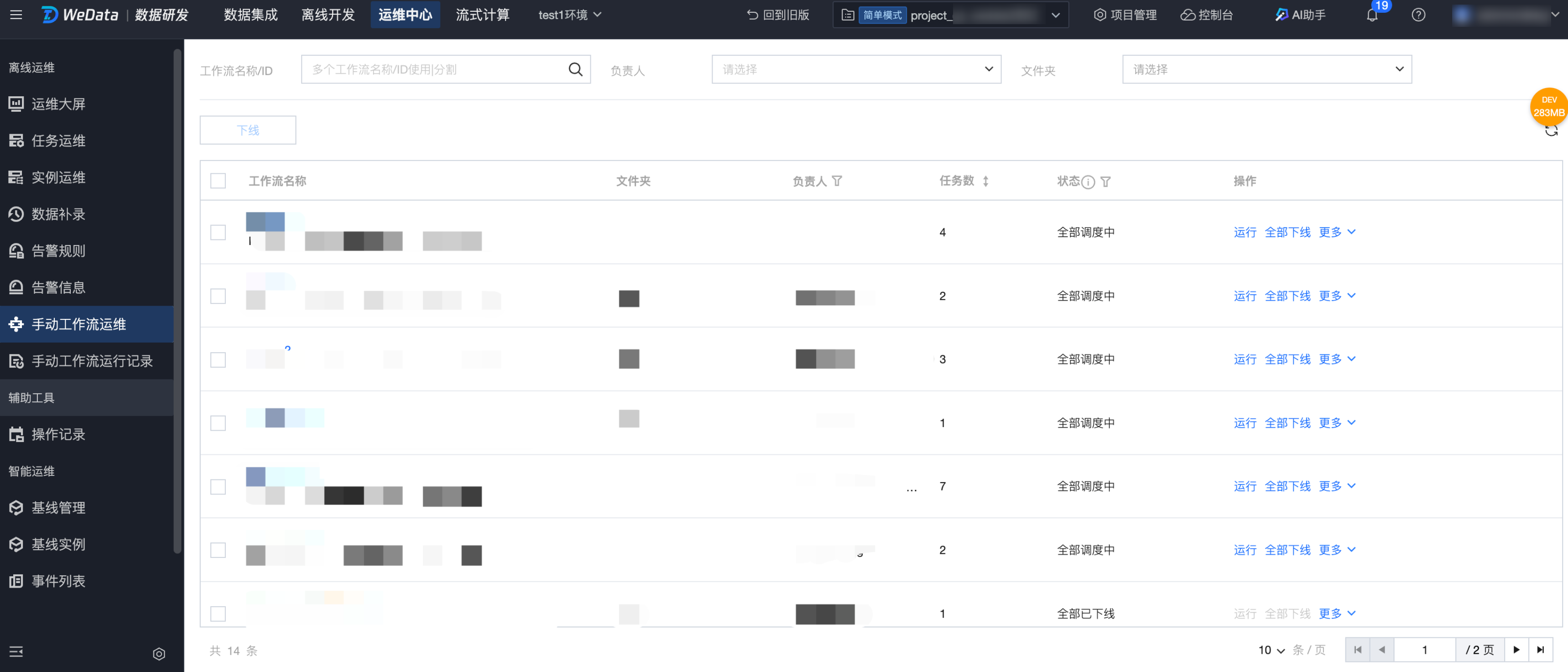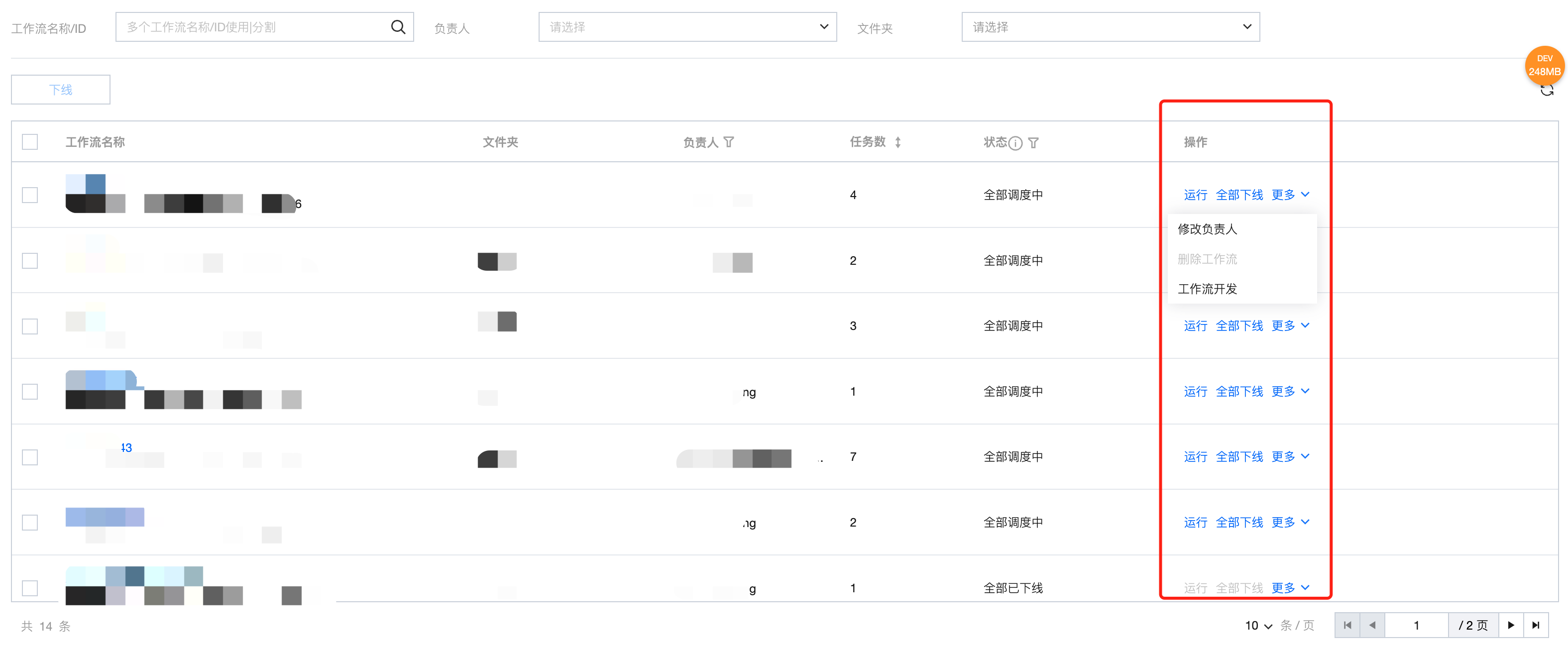 二级列表 | 二级列表为运行下任务维度,展示任务相关信息。 信息包含:任务名称、负责人、任务类型、实例个数、状态。 ![]() |
