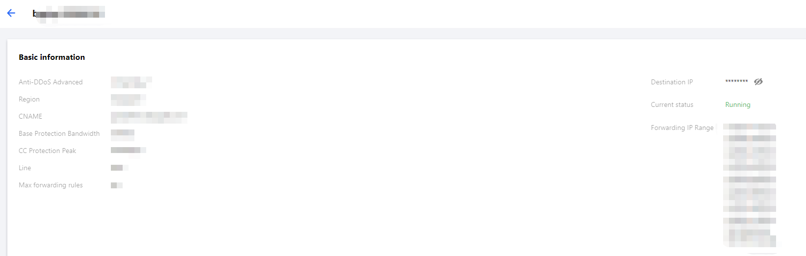 Current status | The current status of the Anti-DDoS Advanced instance, such as Running, Cleansing, and Blocked. |