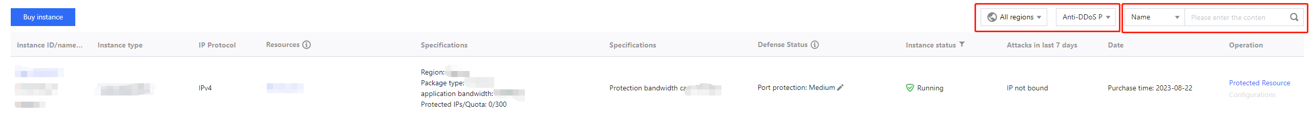 Region | The region selected when the Anti-DDoS Pro instance is purchased. |