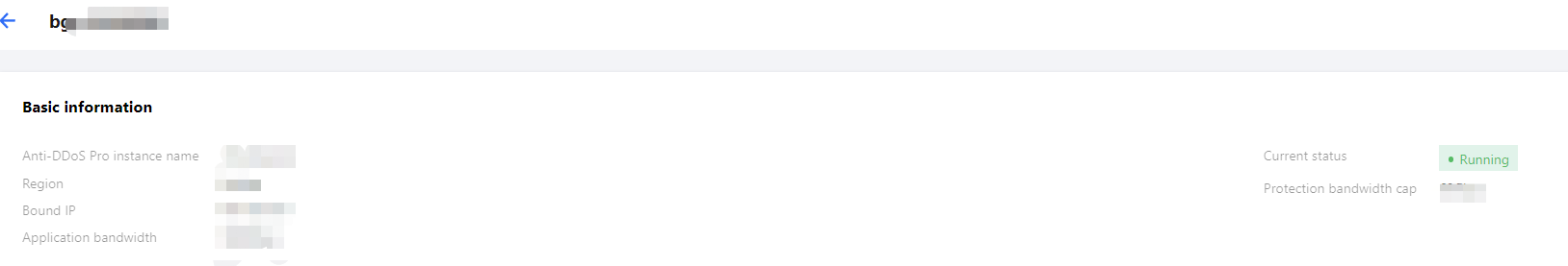 Current status | The current status of the Anti-DDoS Pro instance, such as Running, Cleansing, and Blocked. Creating: The instance is being created. Running: The instance is providing protection. Attacked: Under attacks. Blocked: The instance is blocked. Unblocking: The instance is being unblocked. Reclaiming: The instance has expired and is being repossessed. |