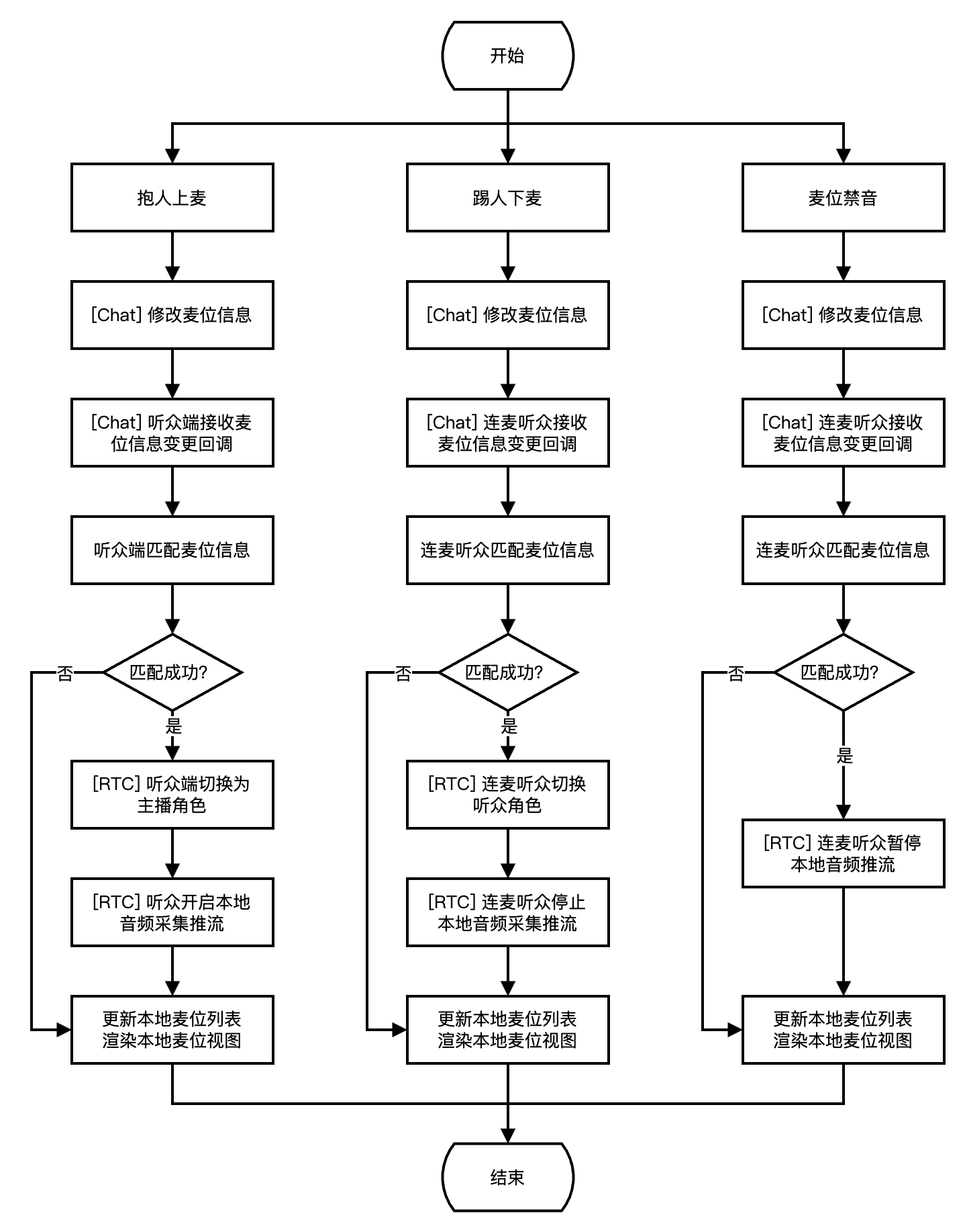 // 本地保存的全量麦位信息列表@property (nonatomic, copy) NSArray<SeatInfoModel *> *seatInfoArray;// 主播端调用该接口修改群属性保存的麦位信息- (void)pickSeatWithUserId:(NSString *)userId seatIndex:(NSInteger)seatIndex {// 创建麦位信息实例,存储修改后的麦位信息SeatInfoModel *localInfo = self.seatInfoArray[seatIndex];SeatInfoModel *seatInfo = [[SeatInfoModel alloc] init];seatInfo.status = SeatInfoStatusUsed;seatInfo.mute = localInfo.mute;seatInfo.userId = self.userId;// 将麦位信息对象序列化为 JSON 格式NSString *jsonStr = seatInfo.toJSONString;NSDictionary *dict = @{ [NSString stringWithFormat:@"seat%ld", seatIndex]: jsonStr };// 设置群属性,已有该群属性则更新其 value 值,没有该群属性则添加该属性[[V2TIMManager sharedInstance] setGroupAttributes:self.groupId attributes:dict succ:^{// 修改群属性成功,触发 onGroupAttributeChanged 回调} fail:^(int code, NSString *desc) {// 修改群属性失败,上麦失败}];}// 听众端收到群属性变更回调,匹配自身信息成功后开始推流[[V2TIMManager sharedInstance] addGroupListener:self];- (void)onGroupAttributeChanged:(NSString *)groupID attributes:(NSMutableDictionary<NSString *,NSString *> *)attributes {// 上一次本地保存的全量麦位信息列表NSArray *oldSeatArray = self.seatInfoArray;// 最新从 groupAttributeMap 中解析的全量麦位信息列表NSArray *newSeatArray = [self getSeatListFromAttr:attributes seatSize:self.seatSize];// 遍历全量麦位信息列表,对比新旧麦位信息for (int i = 0; i < self.seatSize; i++) {SeatInfoModel *oldInfo = oldSeatArray[i];SeatInfoModel *newInfo = newSeatArray[i];if (oldInfo.status != newInfo.status && newInfo.status == SeatInfoStatusUsed) {if ([newInfo.userId isEqualToString:self.userId]) {// 匹配自身信息成功,切换 TRTC 角色并开始推流[self.trtcCloud switchRole:TRTCRoleAnchor];[self.trtcCloud startLocalAudio:TRTCAudioQualityDefault];} else {// 更新本地麦位列表,渲染本地麦位视图}}}}