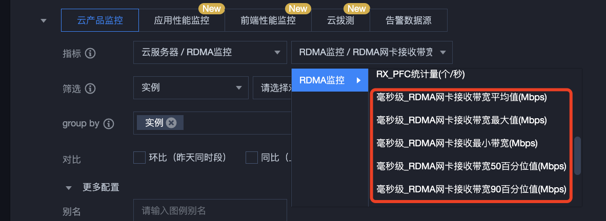 RxHpbwP90 | 毫秒级_RDMA 网卡接收带宽90百分位值 | 10秒内从小到大 RDMA 网卡接收带宽的毫秒级统计粒度前90百分位数 | Mbps | InstanceId | 10s、60s、 300s、 3600s |