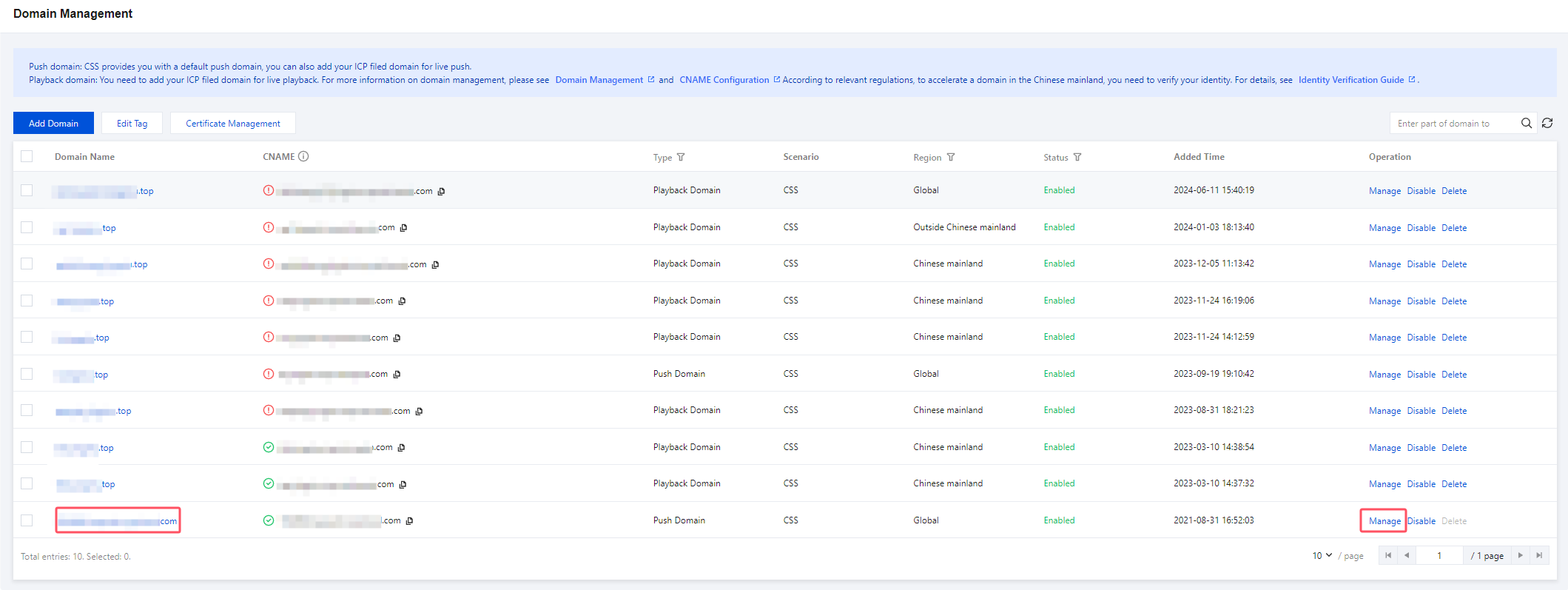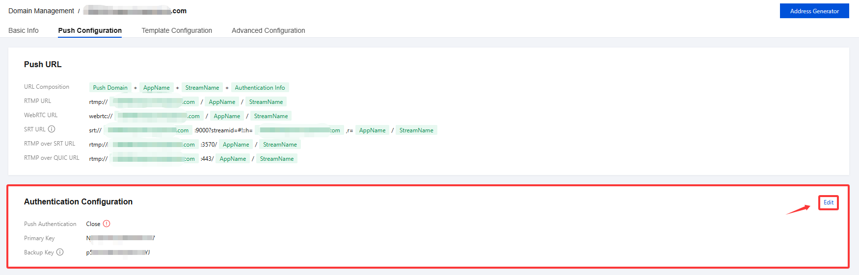 xxxx.tlivepush.com. You can use it to push streams for test purposes, but the test domain should not be used in production environments.