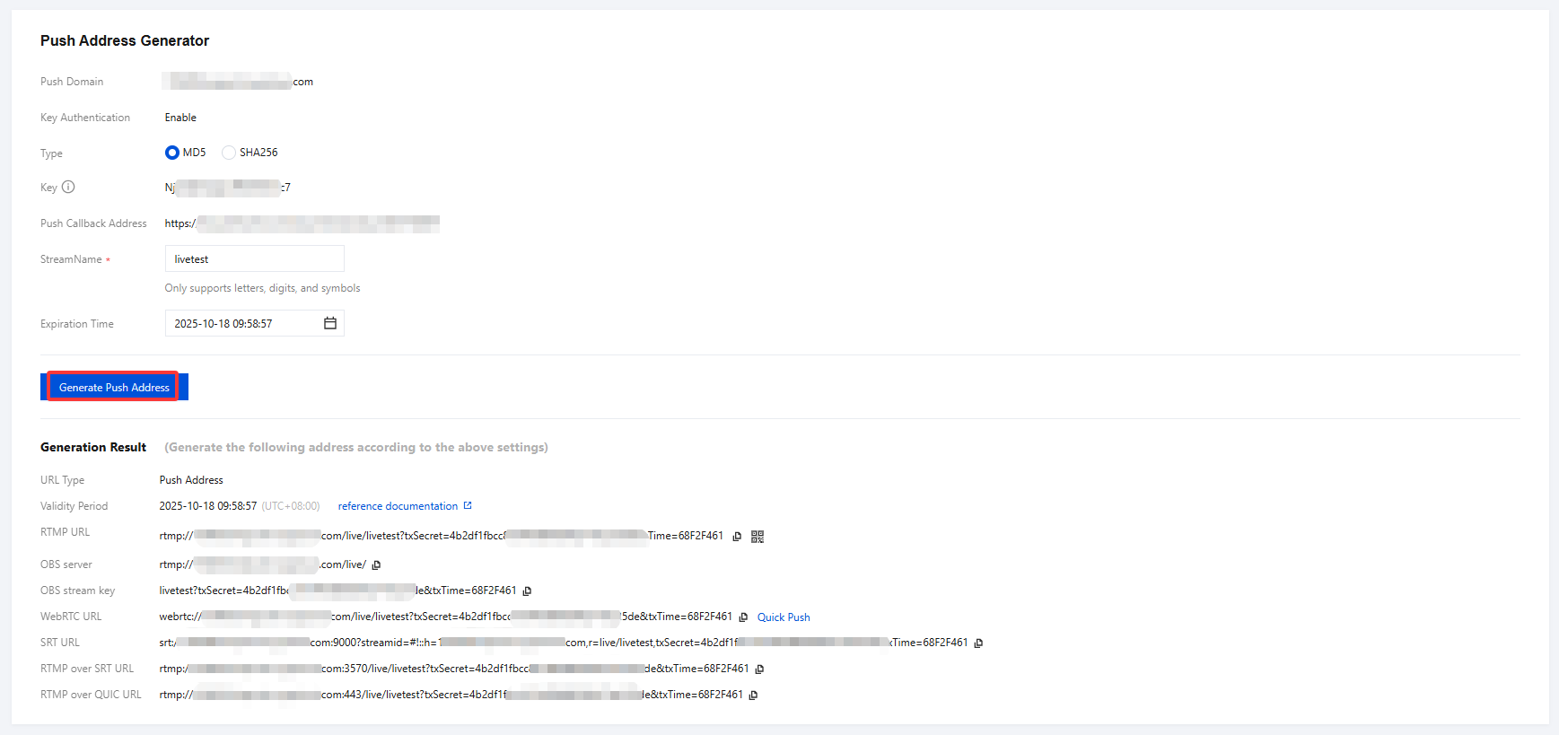 domain: The push domain name.AppName: The live streaming application name, which is live by default and is customizable.StreamName: The custom stream name used to identify a live stream.txSecret: The authentication string generated after push authentication is enabled.txTime: The expiration timestamp for the push URL.txTime indicates the expiration time of the URL.txTime).