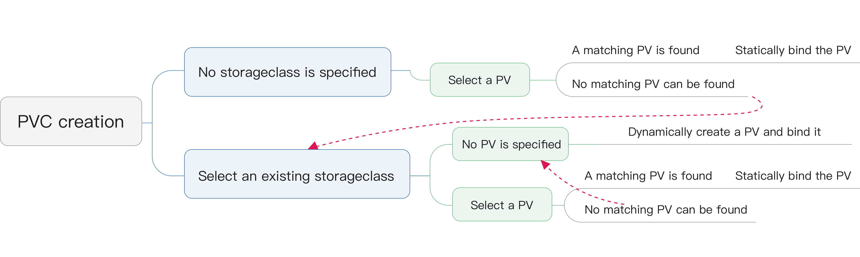 Storageclass | The storageclass of the PV and PVC must be the same (or both empty). |