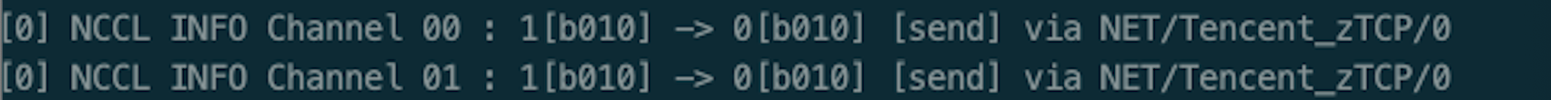 -np and -H parameters. Other parameters are as detailed below:NCCL_ALGO=RING: Select the ring algorithm as the communication algorithm in NCCL.NCCL_DEBUG=INFO: Enable debugging output in NCCL.-mca btl_tcp_if_include eth0: Select the eth0 device as network device for MPI multi-server communication. As some ENIs cannot communicate, you need to specify the ENI if there are multiple ones; otherwise, an error will occur if MPI chooses an ENI that cannot communicate.Model: CVM GT4.41XLARGE948 (A100 * 8 + 50G VPC) GPU driver: 460.27.04 Container: ccr.ccs.tencentyun.com/qcloud/taco-training:cu112-cudnn81-py3-0.3.2 | ||