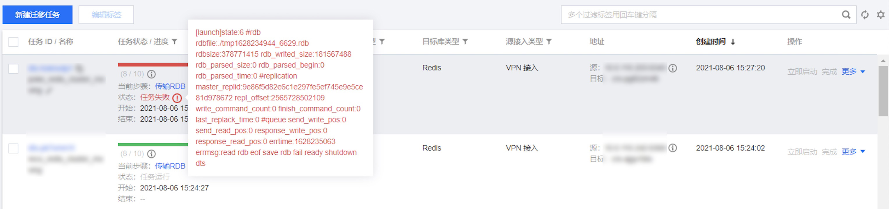 [launch]state:6 #rdb rdbfile:./tmp1600869159_89068.rdb rdbsize:2753701723 rdb_writed_size:1606959104 rdb_parsed_size:0 rdb_parsed_begin:0 rdb_parsed_time:0 #replication master_replid:0549e2f0bdf373cef0c4c89bb0ce9e1757c4b105 repl_offset:1327777565448 write_command_count:0 finish_command_count:0 last_replack_time:0 #queue send_write_pos:0 send_read_pos:0 response_write_pos:0 response_read_pos:0 errtime:1600870264 errmsg:read rdb eof save rdb fail ready shutdown dts