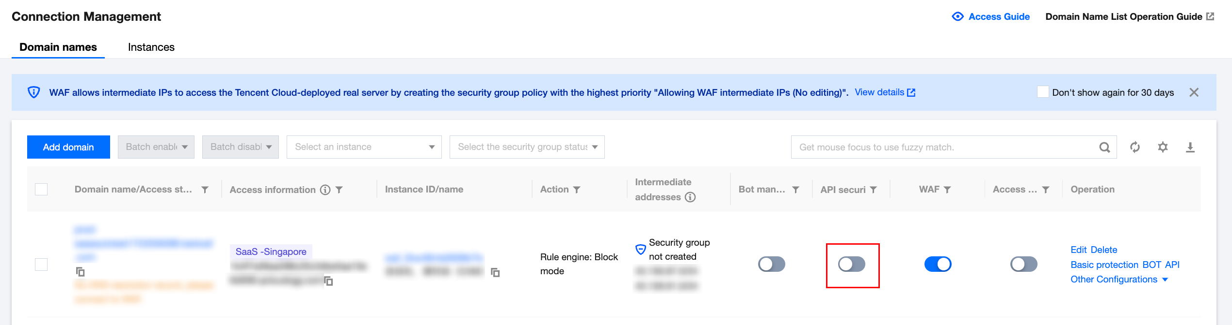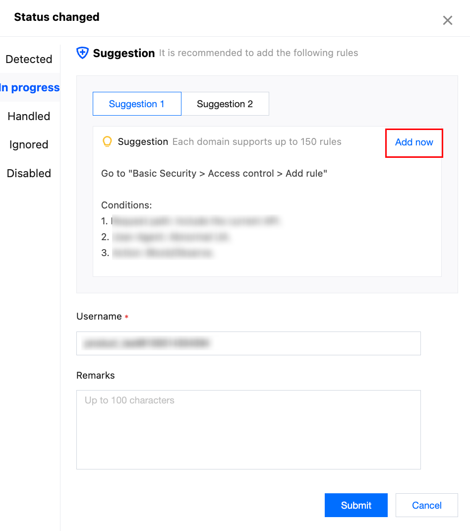 Status | Current event status of the API event. Detected: detected and unconfirmed API event In progress: API event with risks being confirmed and related rules being configured. This status includes processing suggestions for the event type (CC/access control/BOT, etc.), and appropriate rules can be added with one click. Handled: API event with risks confirmed and handling rules added Ignored: confirmed as not needing handling and ignored Disabled: Observed access traffic and attack traffic situation, confirming that the event can be completely closed. |
