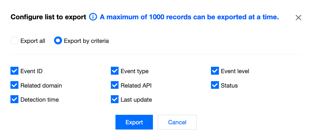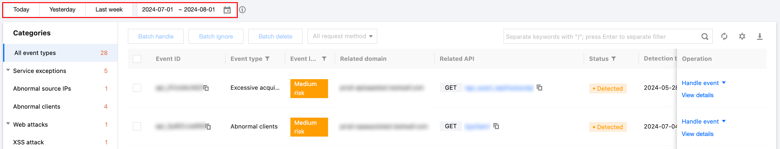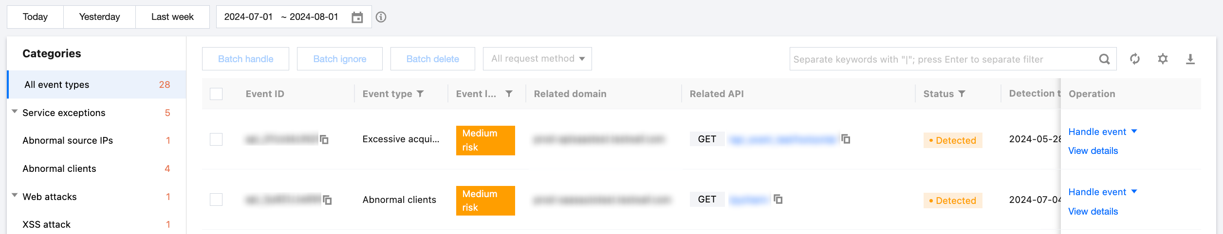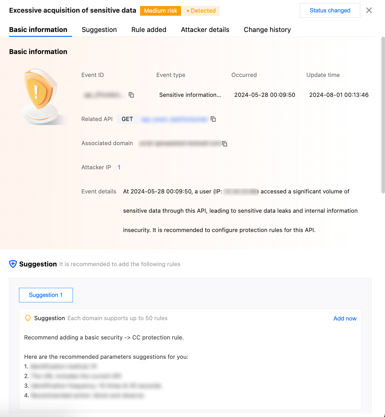 Basic information | Mainly includes Event ID, Event type, Occurred, Update time, Related APl, Associated domain name, and Event details. |