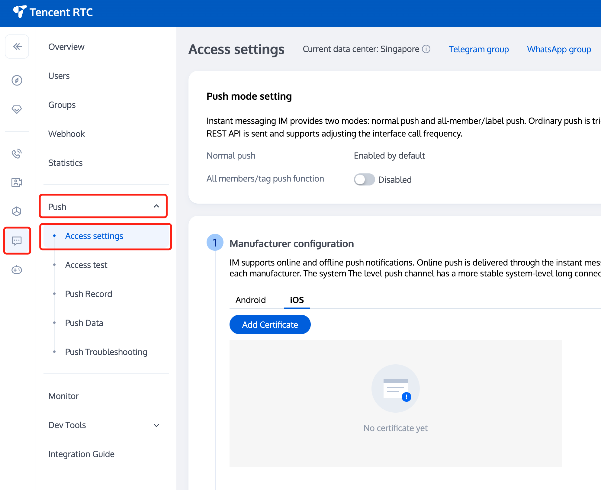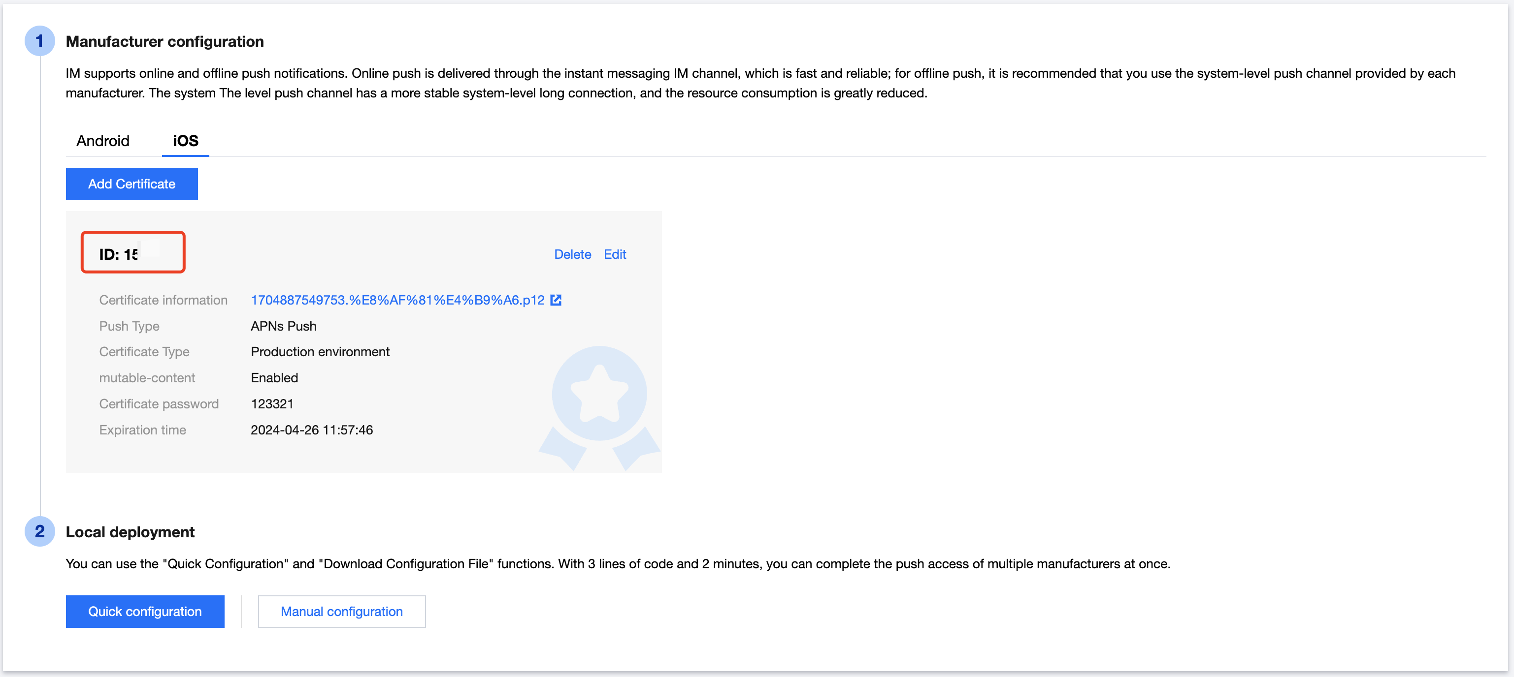 #pragma mark - TIMPush- (int)businessID {//上一步控制台给的证书ID,如 1234567int kBusinessID = 1234567;return kBusinessID;}- (NSString *)applicationGroupID {//AppGroup IDreturn kTIMPushAppGroupKey;}- (BOOL)onRemoteNotificationReceived:(NSString *)notice {// custom navigatereturn NO;}