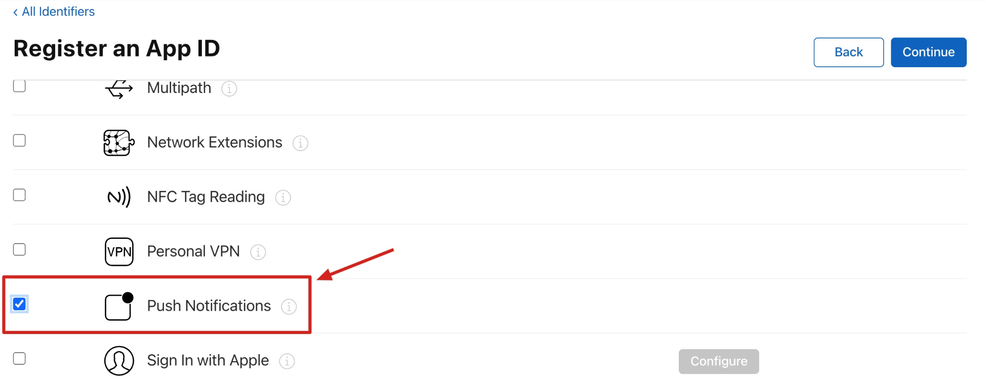 Push Notification 的 Service。Bundle ID 不能使用通配符 *,否则将无法使用远程推送服务。Bundle ID等其他信息,单击 Continue 进行下一步。