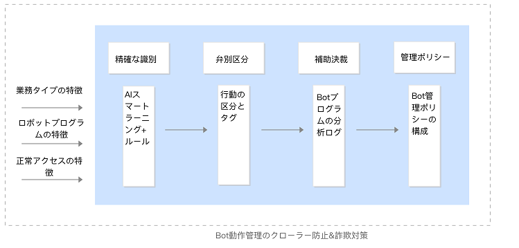 • インテリジェントな識別に公開されていないプログラムおよび悪意のあるクローラープログラムをサポートし、AIテクノロジーを使用してモデリングします。業務トラフィックの特性、人間の正常なアクセス動作、ロボットプログラムへのアクセス動作を学習することにより、異常なクローラープログラムのトラフィックをインテリジェントに弁別します。