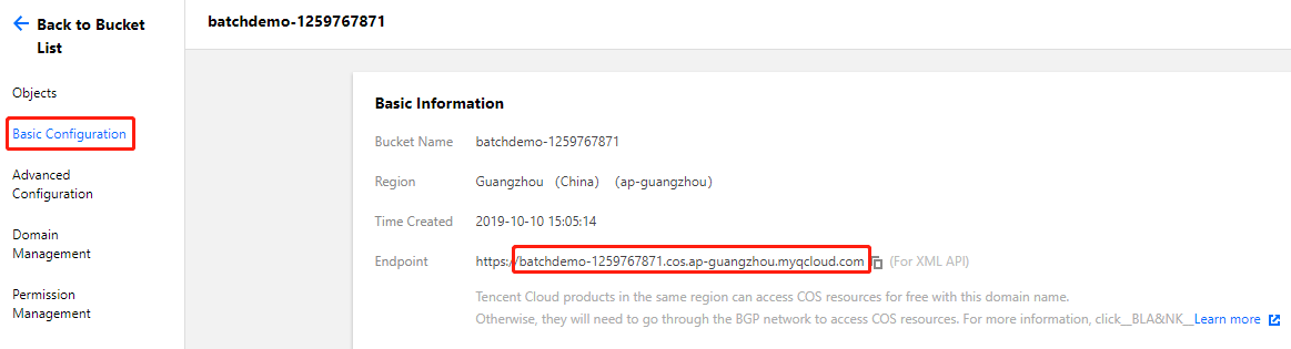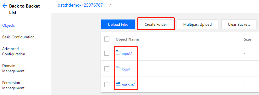 https://batchdemo-xxxxxxxxx.cos.ap-guangzhou.myqcloud.com,可通过 域名+文件夹 推算出在 创建 Bucket 及子文件夹 中创建的3个文件夹的访问域名。如下所示:cos://batchdemo-xxxxxxxxx.cos.ap-guangzhou.myqcloud.com/logs/cos://batchdemo-xxxxxxxxx.cos.ap-guangzhou.myqcloud.com/input/cos://batchdemo-xxxxxxxxx.cos.ap-guangzhou.myqcloud.com/output/1_SimpleStart.py 中的自定义信息部分为例:# custom (Change to your info)imageId = "img-m4q71qnf"Application = {"DeliveryForm": "LOCAL","Command": " python -c \\"fib=lambda n:1 if n<=2 else fib(n-1)+fib(n-2); print(fib(20))\\" "}StdoutRedirectPath = "cos://batchdemo-xxxxxxxxxx.cos.ap-guangzhou.myqcloud.com/logs/"StderrRedirectPath = "cos://batchdemo-xxxxxxxxxx.cos.ap-guangzhou.myqcloud.com/logs/"