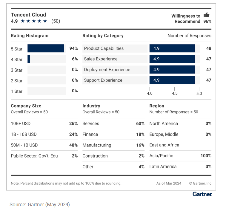 Gartner does not endorse any vendor, product or service depicted in its research publications and does not advise technology users to select only those vendors with the highest ratings or other designation. Gartner research publications consist of the opinions of Gartner’s research organization and should not be construed as statements of fact. Gartner disclaims all warranties, expressed or implied, with respect to this research, including any warranties of merchantability or fitness for a particular purpose. This graphic was published by Gartner, Inc. as part of a larger research document and should be evaluated in the context of the entire document. The Gartner document is available upon request from Tencent Cloud. Gartner and Magic Quadrant are registered trademarks and service marks of Gartner, Inc. and/or its affiliates in the U.S. and internationally and are used herein with permission. All rights reserved.