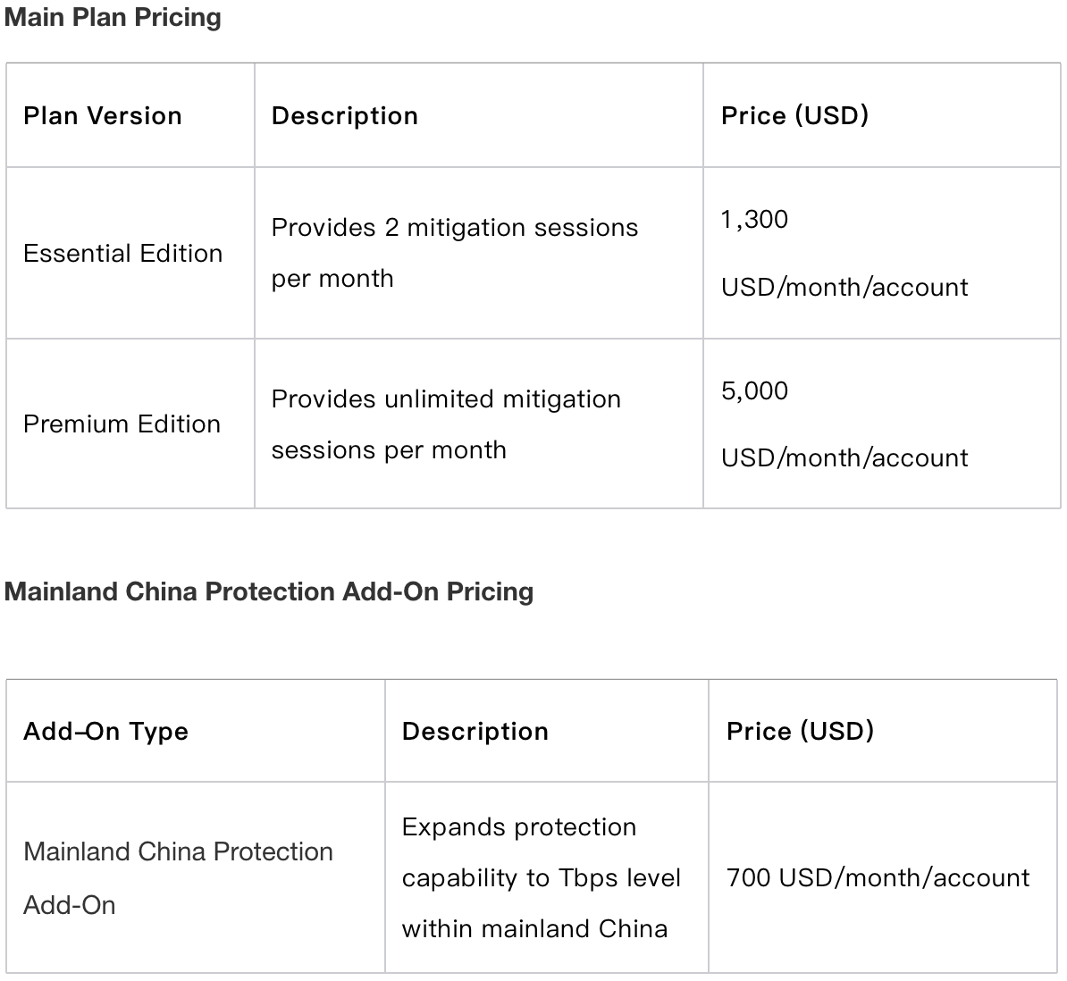 3. Mainland China Protection Add-On: For customers who need higher protection capabilities, we provide a Mainland China protection add-on to enhance the protection capabilities to Tbps level.