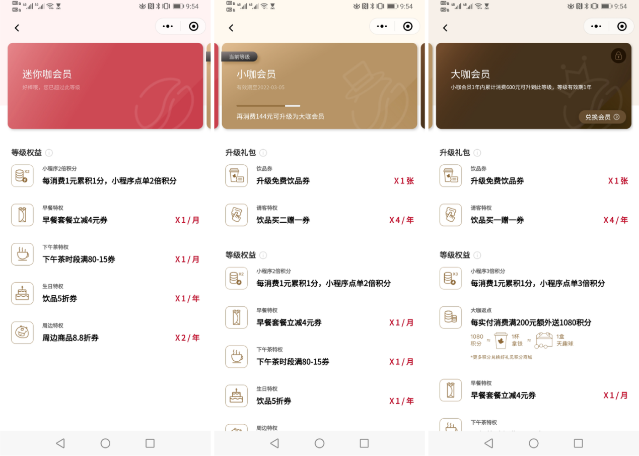 另外,小程序也是Tims会员体系重要的载体。从“迷你咖”到“大咖会员”,小程序搭建了完整的会员路径,引导折扣权益、情感权益,并探索成就徽章、免排队等新权益,让会员的粘性越来越高。同时,会员体系也是会员个性化运营的重要依据。Tims针对不同的会员标签去做不同的营销动作,根据消费频率、消费喜好,推送不同的券包,响应用户需求,收到了更好的营销效果。