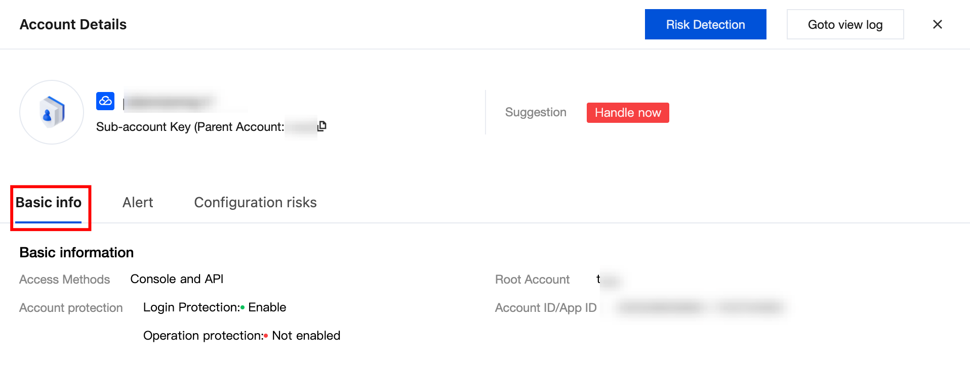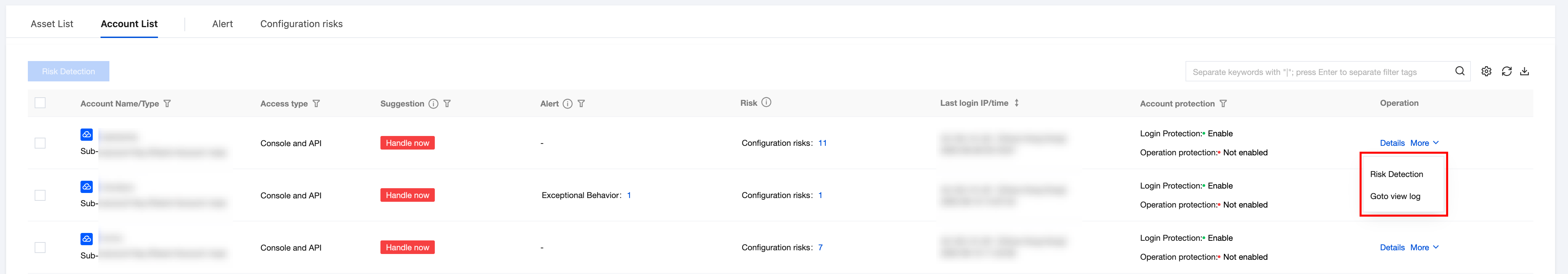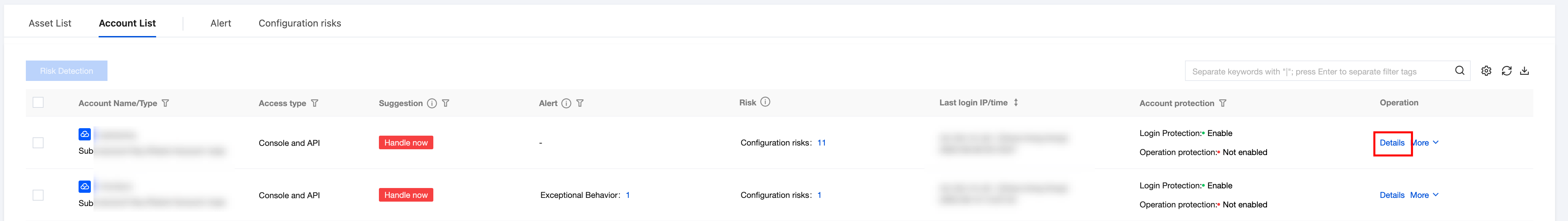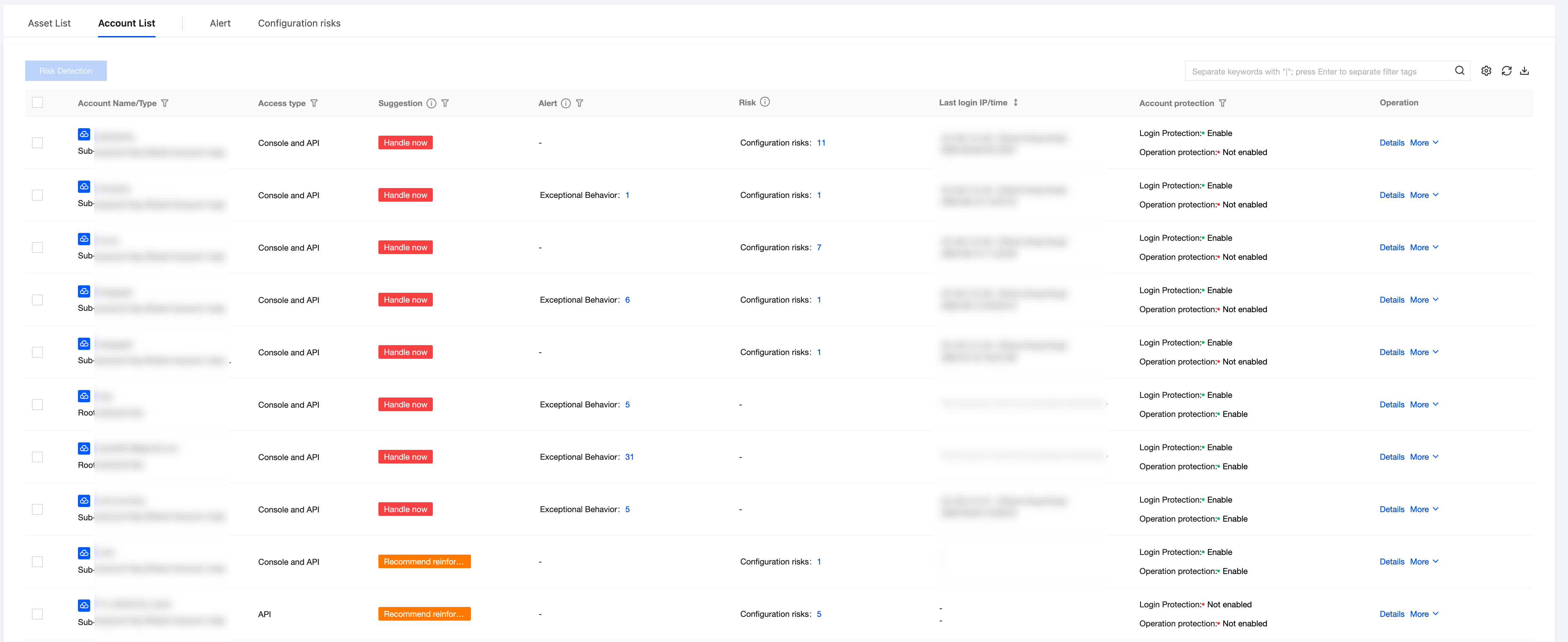 Account Protection | Login protection: Enable Operation protection: Enable | Show the activation of account's login protection and operation protection for security status. Support filtering enable all/partially enabled/not enabled. |