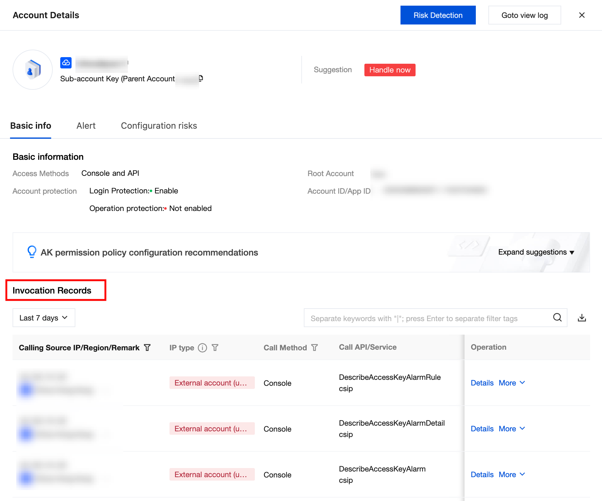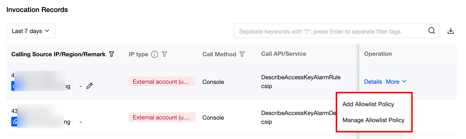 IP address type | Account (with remark) Account (without remark) Account (external, with remark) Account (external, without remark) LAN (with remark) LAN (without remark) | Within the account (with remark): The source IP of calls identified in the CSC asset list, with remark. Within the account (without remark): The source IP of calls identified in the CSC asset list, without remark. Account (external, with remark): IP not within the account but with remark. Account (external, without remark): IP not within the account and without remark. LAN (with remark): Local Area Network IP Address, with remark. LAN (without remark): Local Area Network IP Address, without remark. |
