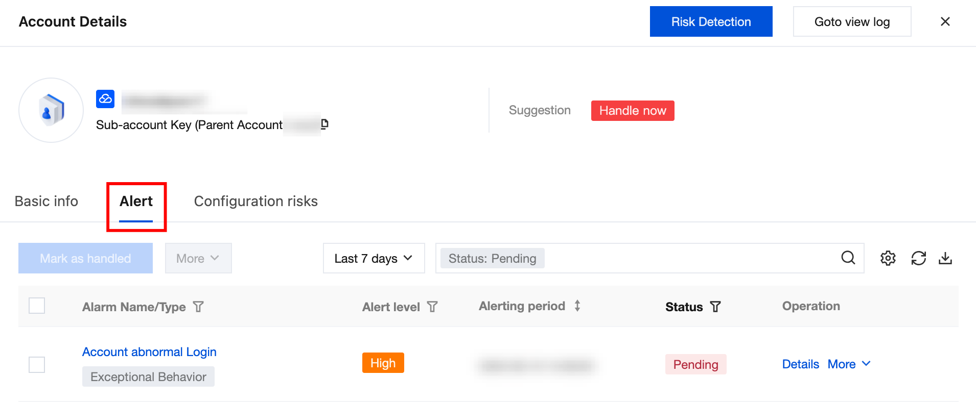 Alarm | Abnormal behavior: x Leakage monitoring: x | Recent unhandled alarms. Click to pull up the AK details drawer and locate the Alarm tab. Support filtering leakage monitoring/abnormal behavior/no alarm. |