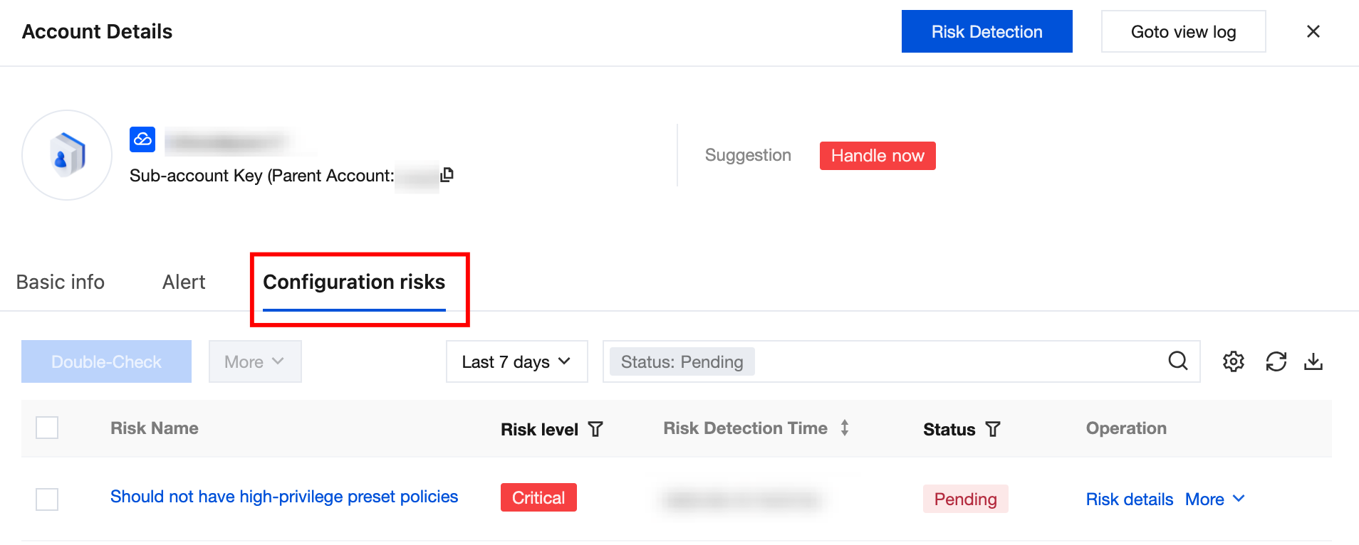 Risk | Configuration risk: x | Recent unhandled risks. Click to pull up the AK details drawer and locate the Risk tab. |