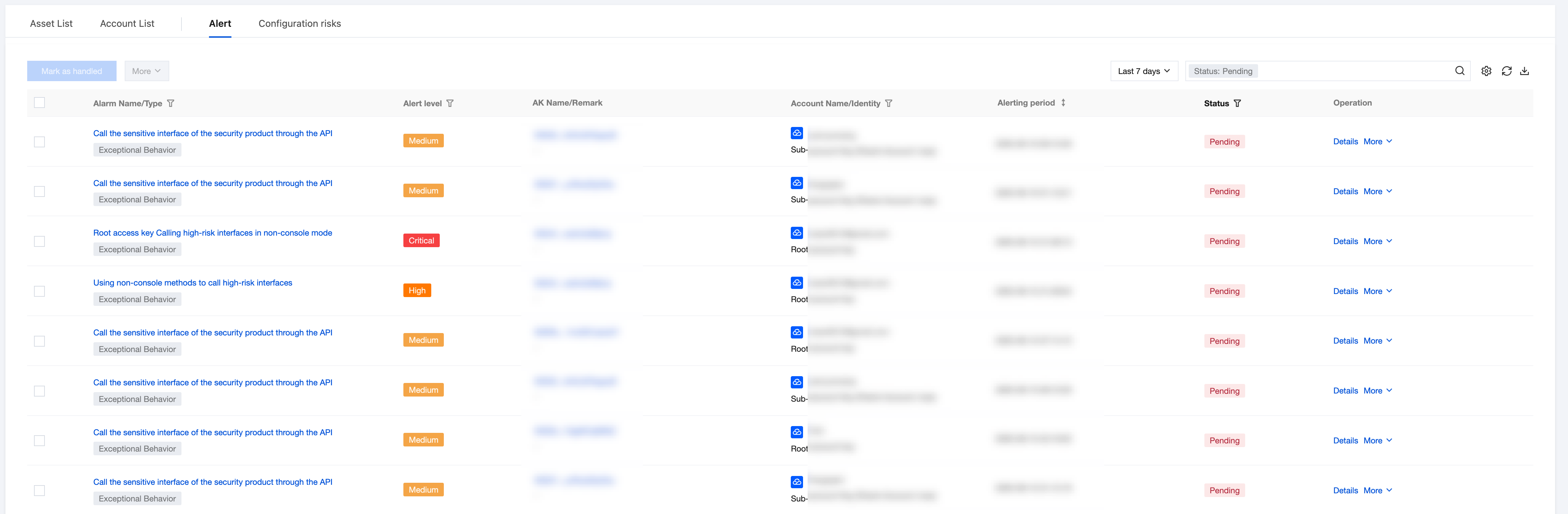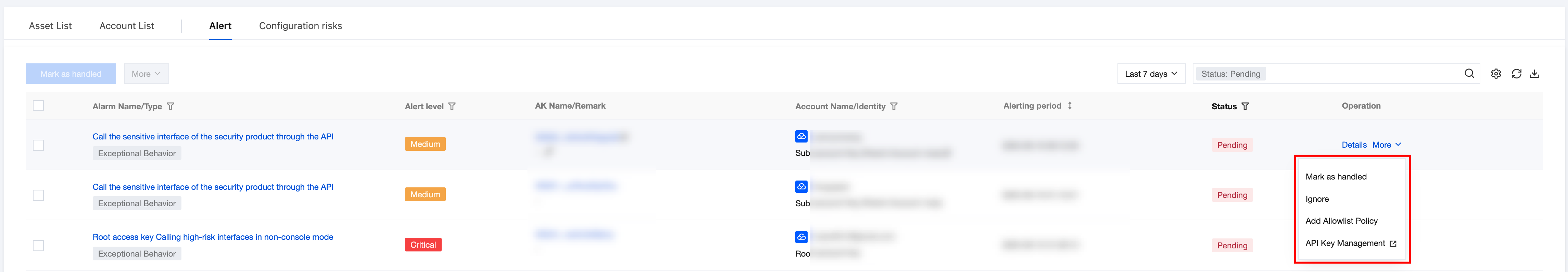 AK name/remark | AKID75XXX Department 1 AK | AK name and custom remarks. AK retains the first 6 and last 11 digits, with the middle omitted, supporting one-click copy; click to pull up the AK detail drawer. Remarks can be custom edited with no more than 20 characters. If empty, display "-". |