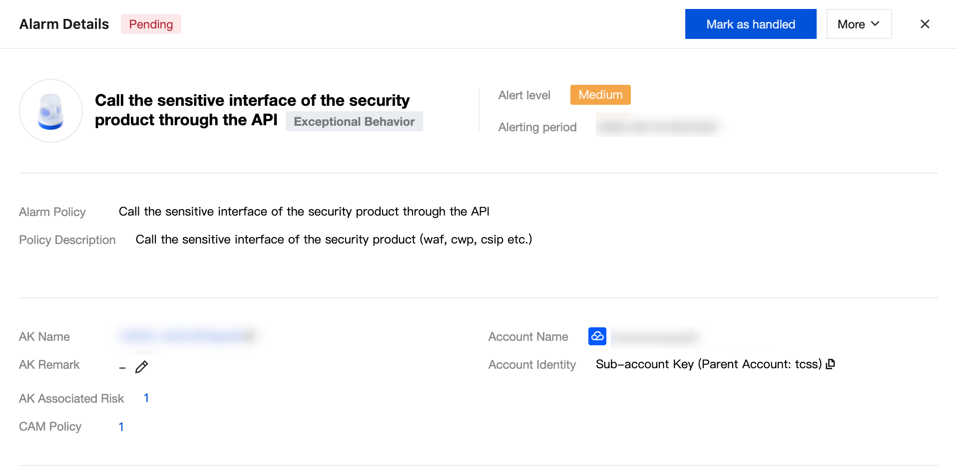 Alarm level | High High-risk Medium Risk Low-risk Note. Invalid | The alarm level is determined based on Tencent Cloud security practice. |