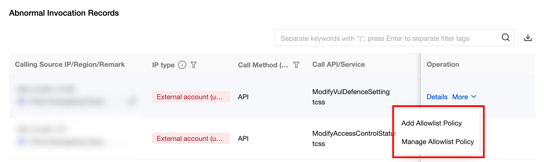 IP type | within the account (with remark) within the account (no remark) outside the account (with remark) outside the account (no remark) LAN (with remark) LAN (no remark) | within the account (with remark): the source IP of calls identified in the CSC asset list, with remark. within the account (without remark): the source IP of calls detected in the CSC asset list, no remark. outside the account (with remark): IPs not within the account but with remark. outside the account (without remark): IPs not within the account and without remark. LAN (with remark): Local Area Network IP Address, with remark. LAN (without remark): Local Area Network IP Address, without remark. |