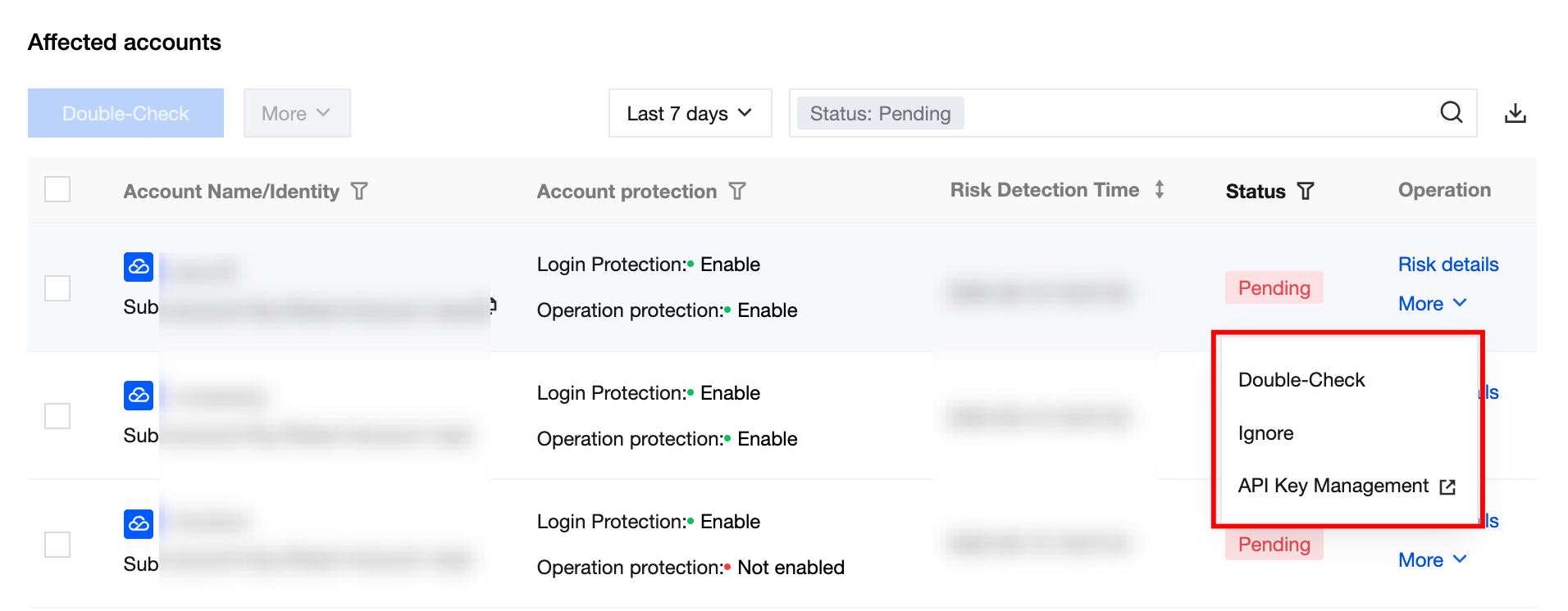 account protection | Login protection: Enable Operation protection: Enable | Show the account's login protection and operation protection security status activation. Support filtering enable all/partially enabled/not enabled. |