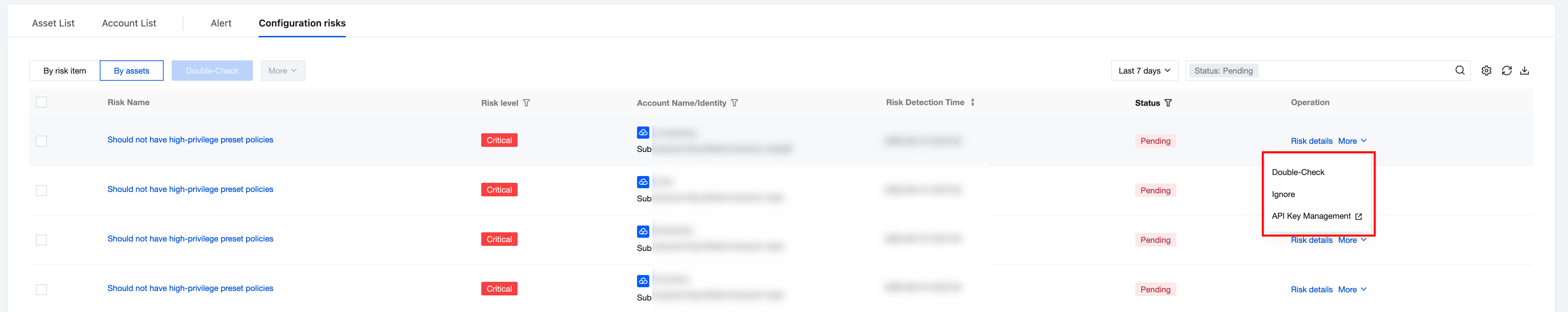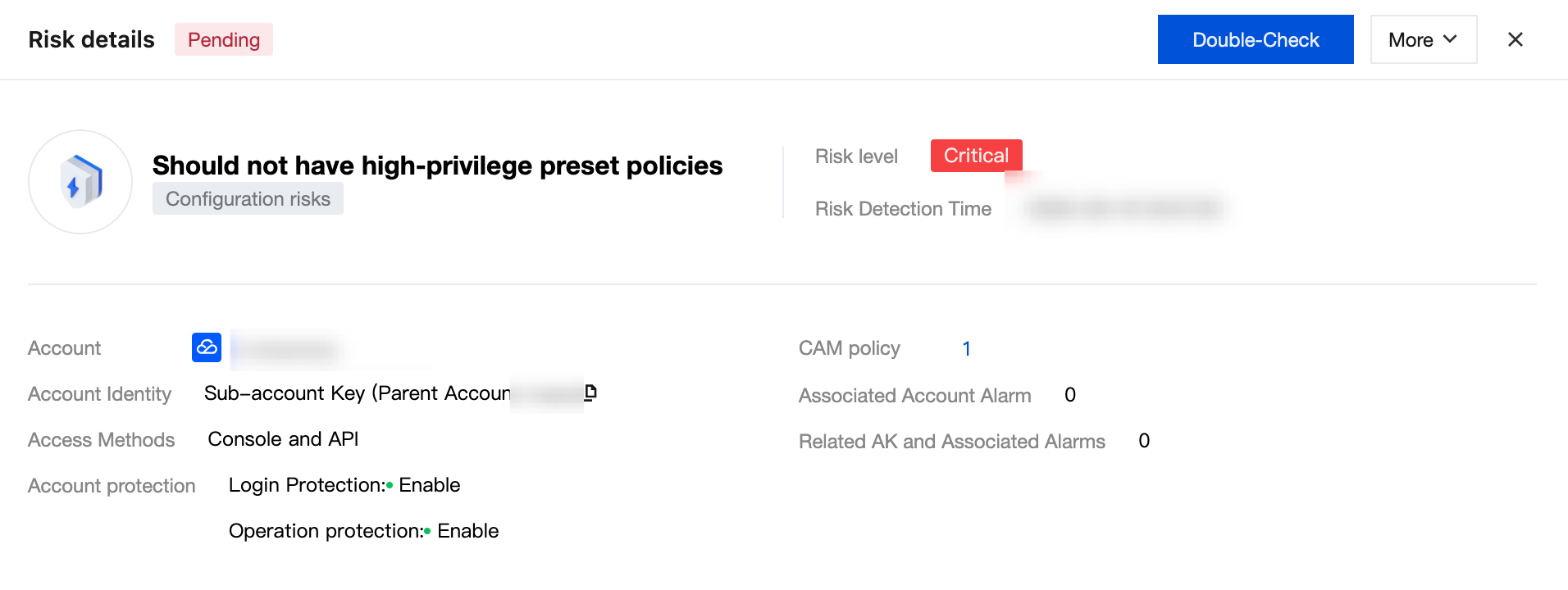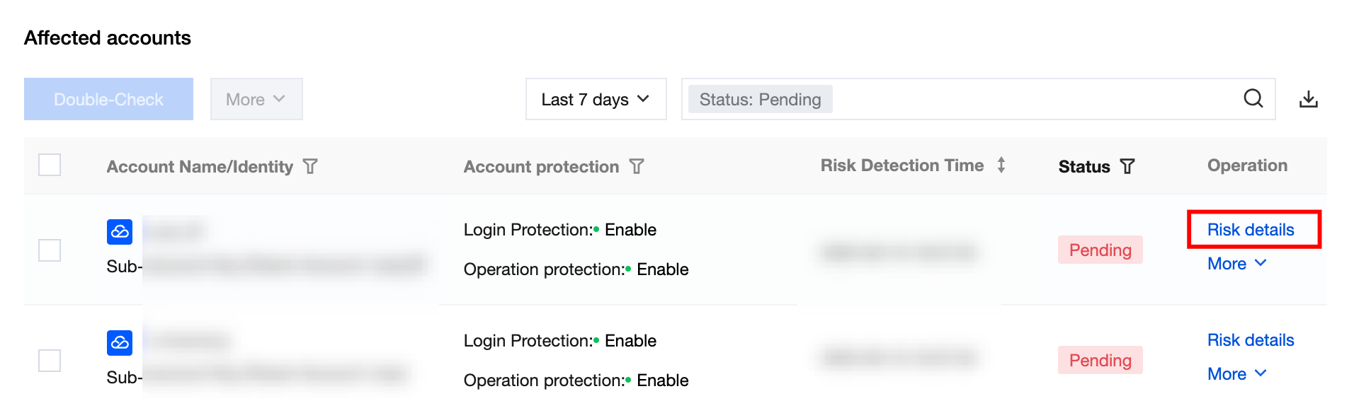 Details | Click to pull up the risk item details drawer, view the risk description and associated account info, and perform corresponding operations based on the account's current processing status. |