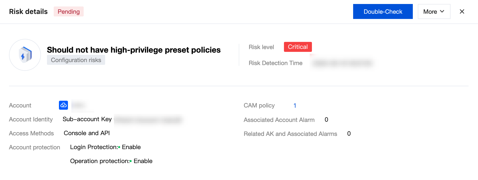 Risk name | Should not have high-privilege preset policies | Click to pull up the risk details drawer. |