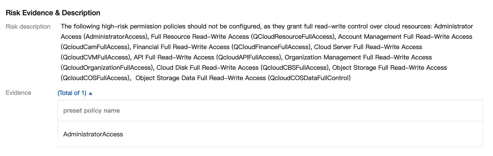 Should not have high-privilege preset policies | AKs should not have high-privilege preset policies like AdministratorAccess, QCloudResourceFullAccess, QCloudCAMFullAccess, or QCloudFinanceFullAccess. |