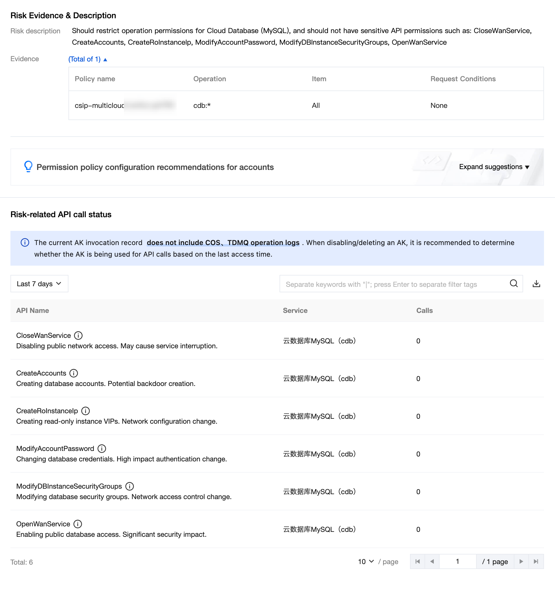 Operation permissions for TencentDB for MySQL should converge. | Operation permissions for TencentDB for MySQL should converge. The following sensitive API permissions should not be granted: CloseWanService, CreateAccounts, CreateRoInstanceIp, DescribeAccounts, DescribeBackups, DescribeBinlogs, ModifyAccountPassword, ModifyDBInstanceSecurityGroups, OpenWanService. |