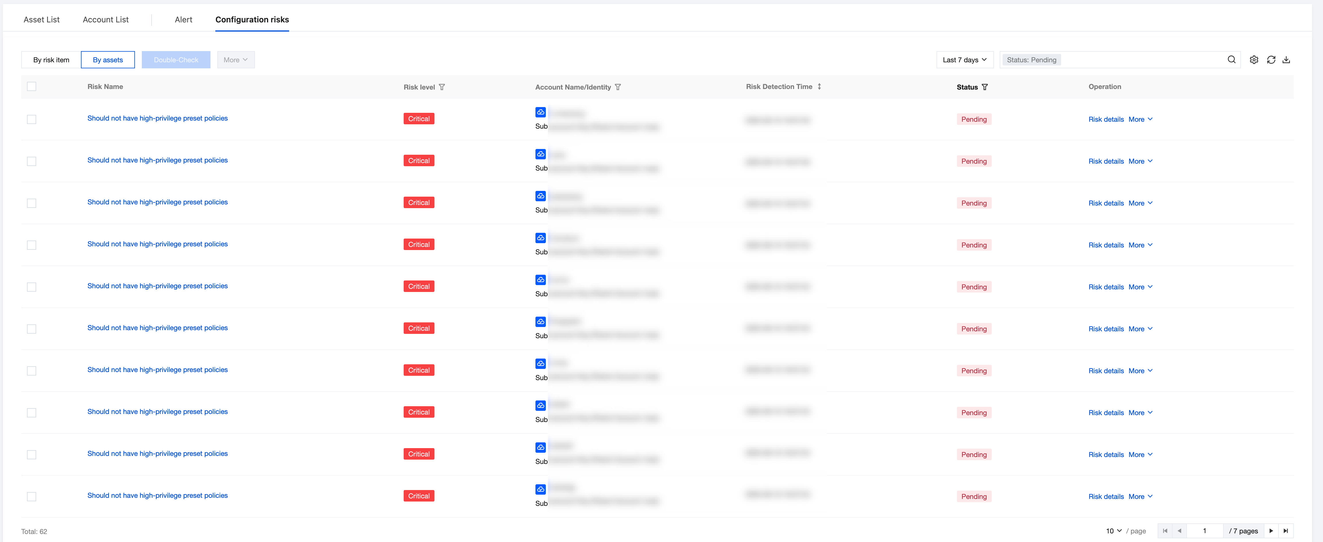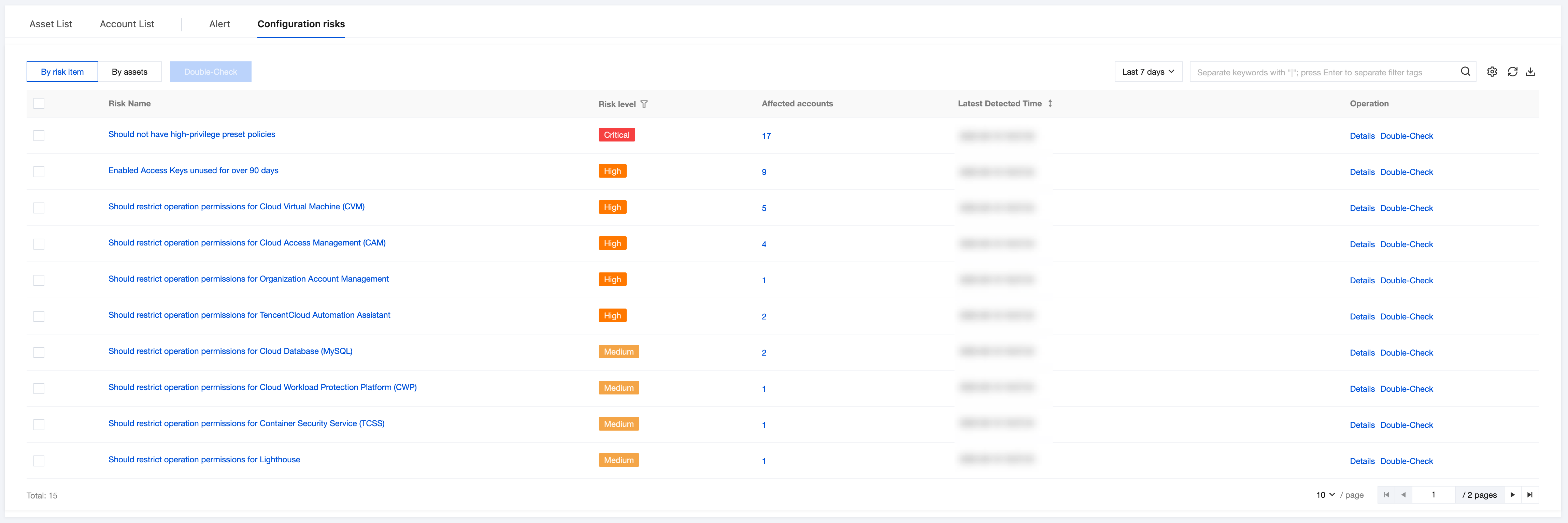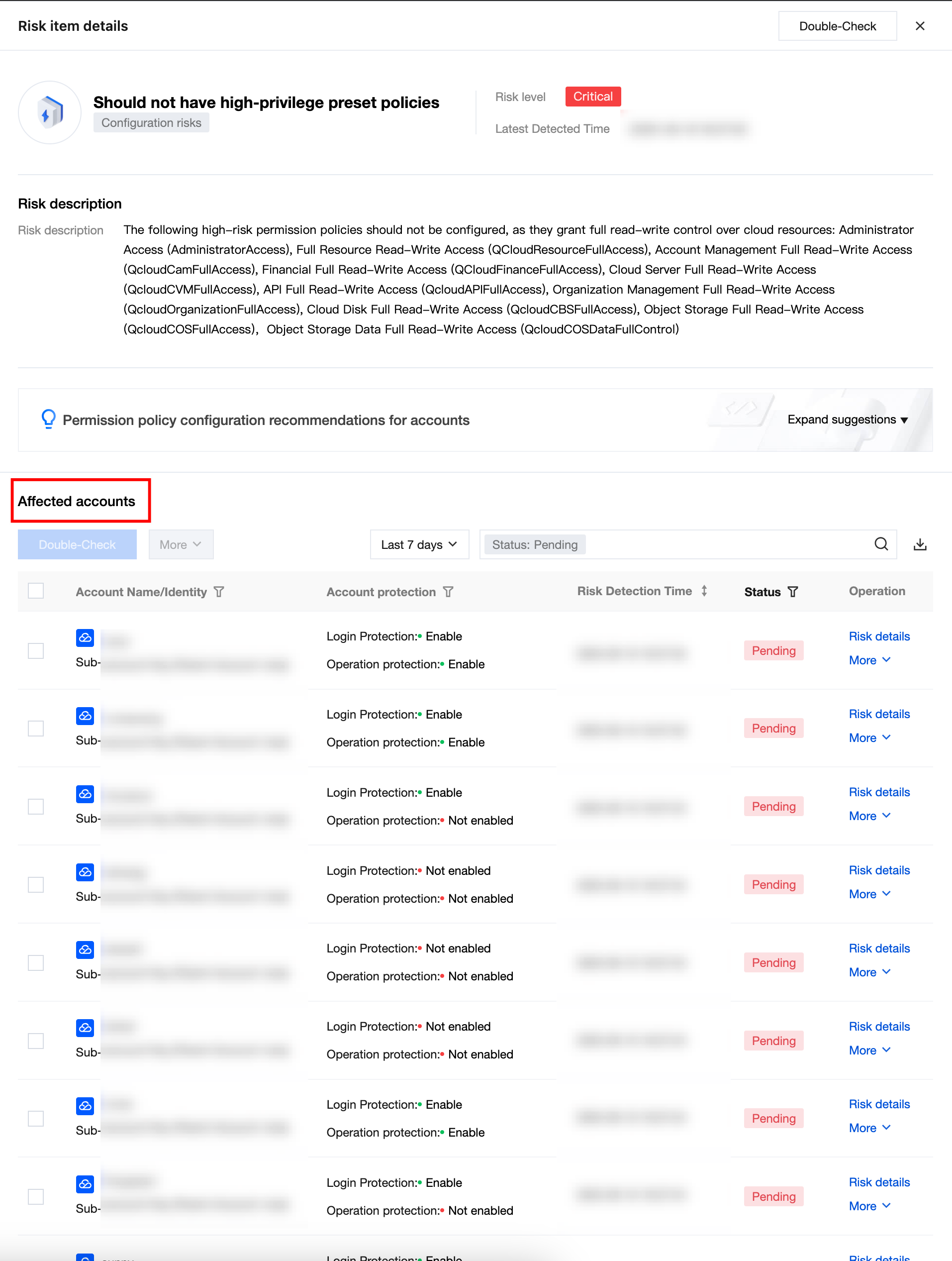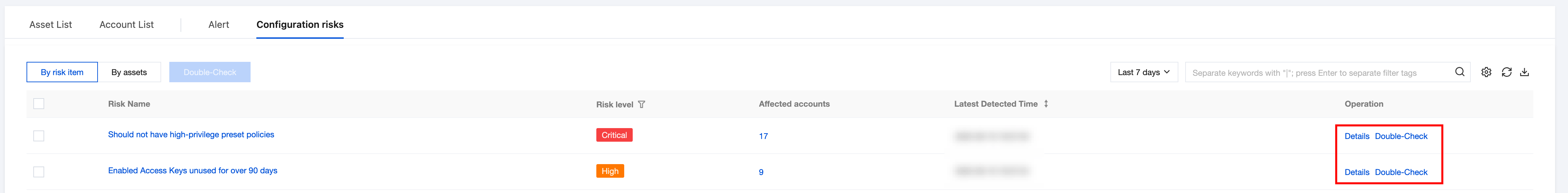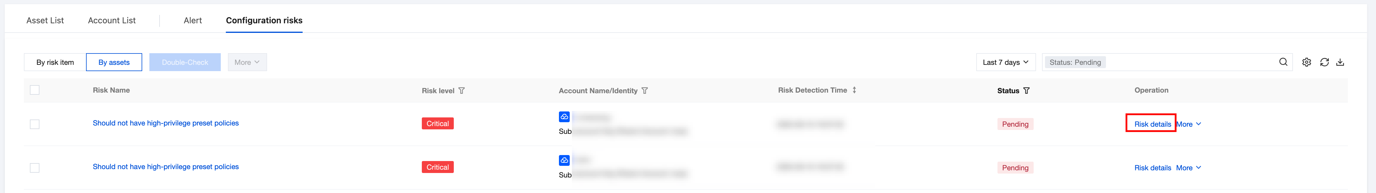 Risk name | Should not have high-privilege preset policies | Click to pull up the risk item details drawer. |