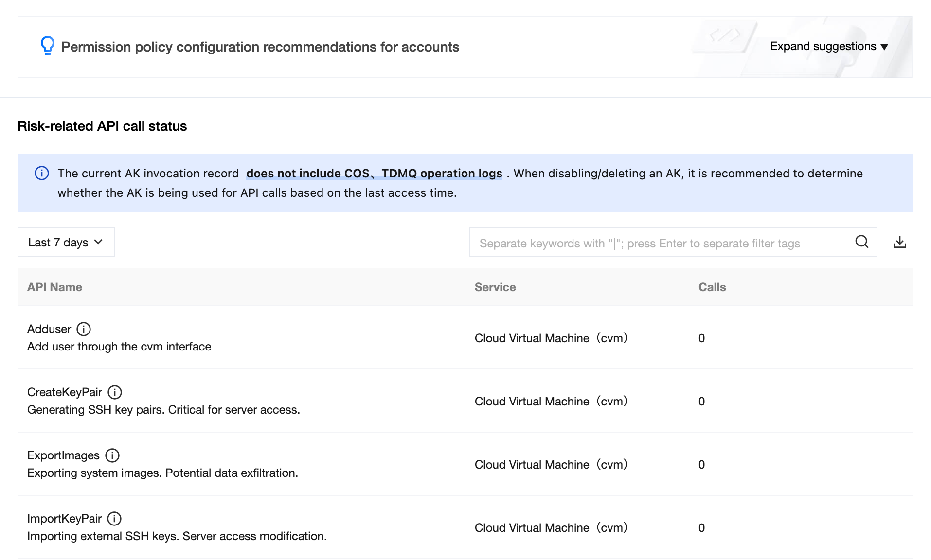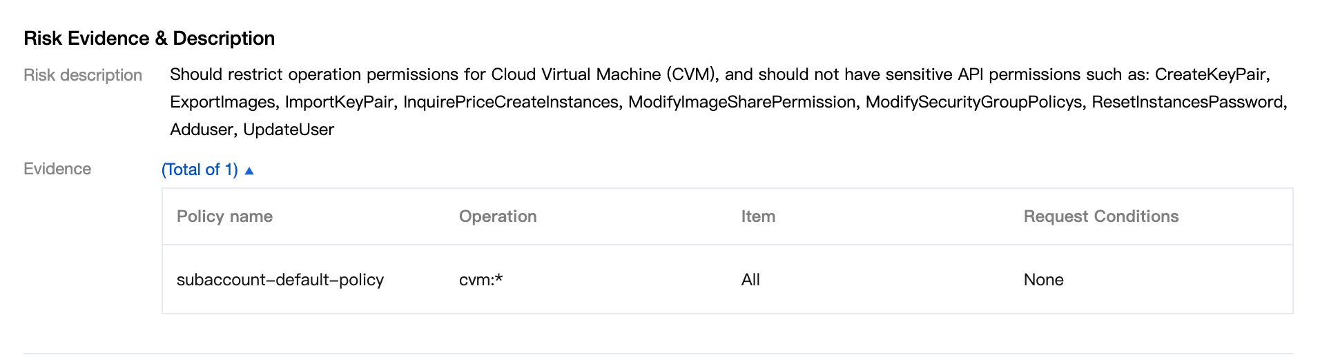 Operation permissions for Cloud Virtual Machine (CVM) should converge. | Operation permissions for CVM should converge. The following sensitive API permissions should not be granted: CreateKeyPair, ExportImages, ImportKeyPair, InquirePriceCreateInstances, InquiryPriceRunInstances, ModifyImageSharePermission, ModifySecurityGroupPolicies, ResetInstancesPassword, RunInstances, AddUser, UpdateUser. |