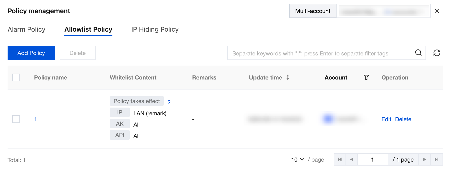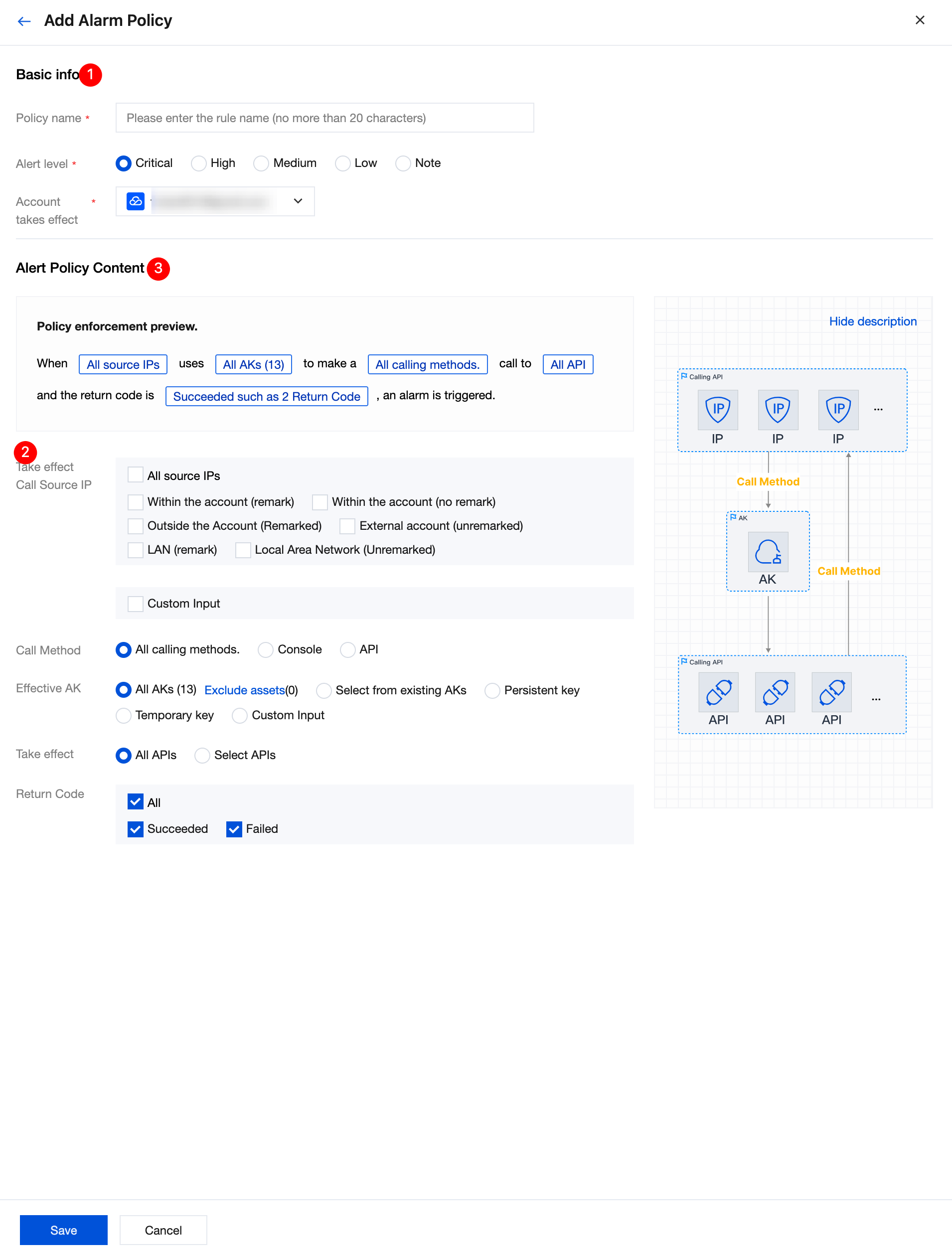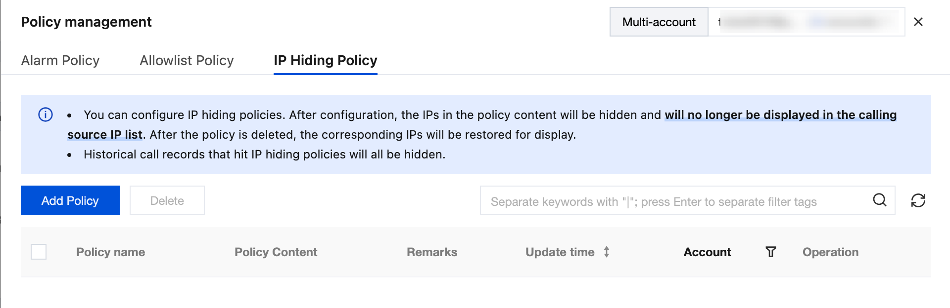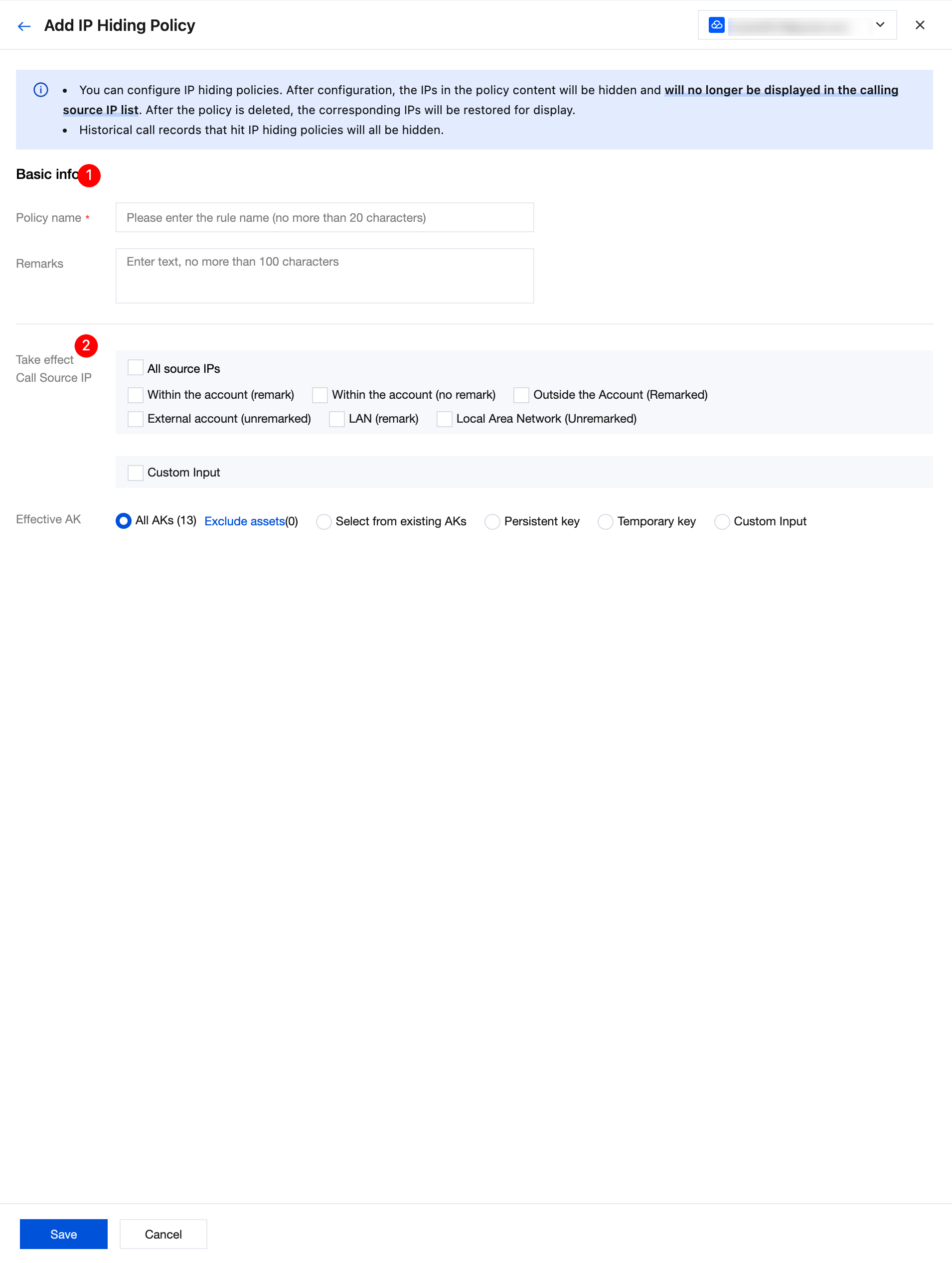 Take effect Call Source IP | Support selecting all source IPs, or filtering by type such as within the account, LAN, remark status. It also supports manual input of IPs or ranges. Multiple IPs or types should be entered on different lines, up to 1000 lines. | 1.x.x.1 x.x.x.x/24 |