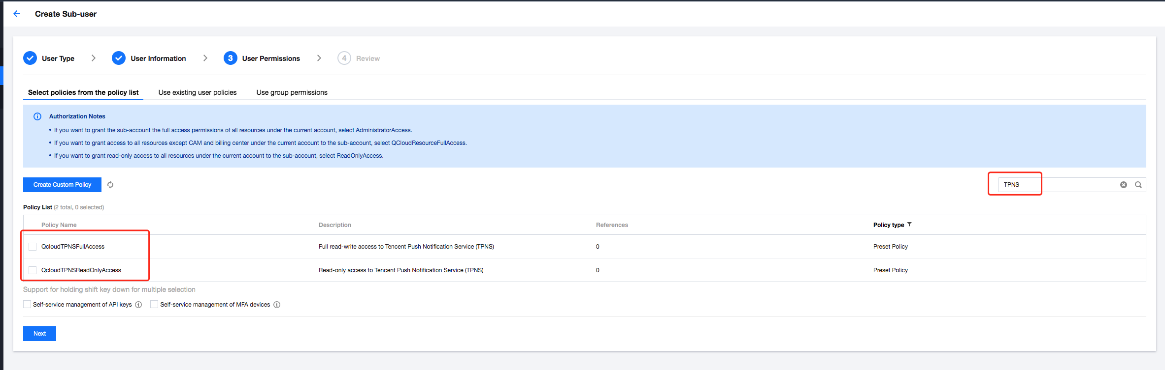 QcloudTPNSFullAccess | 可对主账号下所有应用进行所有权限 |