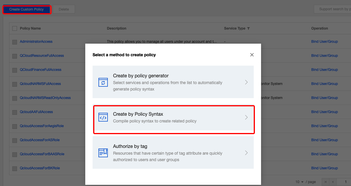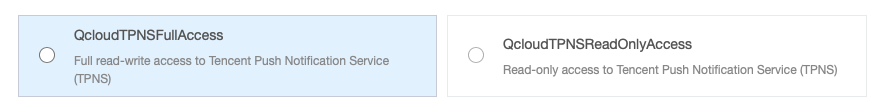 The corresponding policy syntax should be as follows://{"version": "2.0","statement": [{"action": ["tpns:Describe*","tpns:CancelPush","tpns:DownloadPushPackage","tpns:CreatePush","tpns:UploadPushPackage"],"resource": ["qcs::tpns::uin/1000000000:app/1500000000","qcs::tpns::uin/1000000000:app/1500000001"],"effect": "allow"},{"action": ["tpns:Describe*"],"resource": ["qcs::tpns::uin/1000000000:other/*"],"effect": "allow"}]}