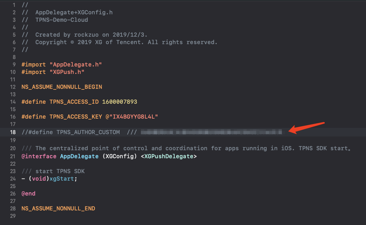 xgPushDidRegisteredDeviceToken:error: returns a success.delAccountsByKeys:[[NSSet alloc] initWithObjects:@(1002), nil] to delete a mobile number.AppDelegate.h file to demonstrate the feature in the demo, as shown in the figure below: