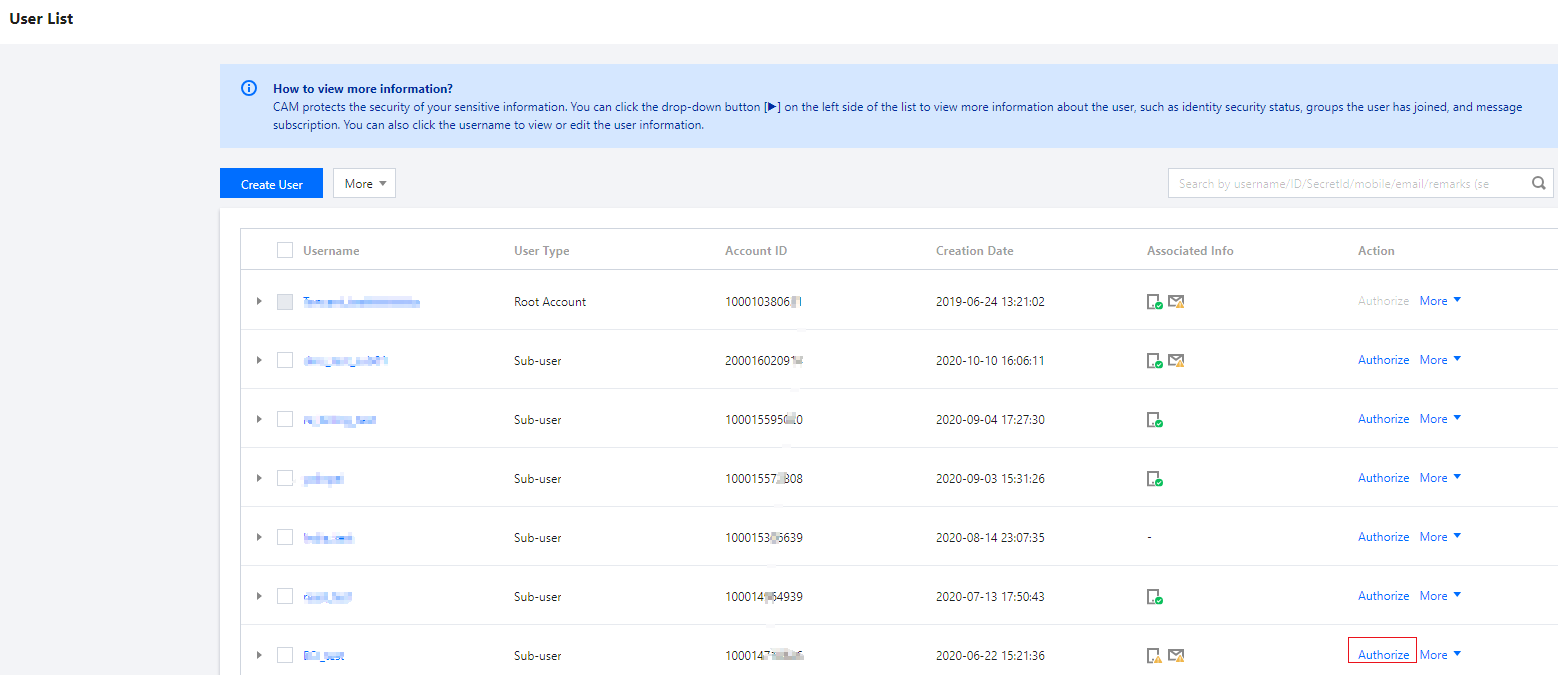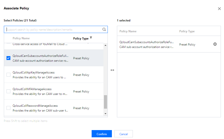 1. Log in to CAM Console, find the corresponding Sub-user or collaborator in Users > User List, then click Authorize. 2. Search for the policy listed in the table above (the following image takes QcloudEMRFullAccess policy as an example) within Associated Policies. Once the policy is selected, click OK to confirm.