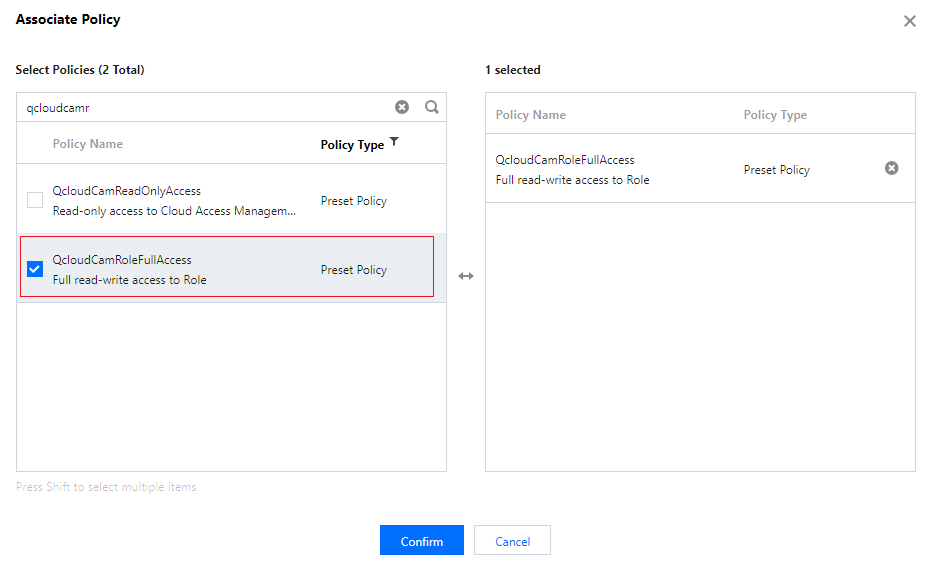 QcloudCamRoleFullAccess | Full read-write access for CAM Users and Roles | No | Used as a Custom service role, it provides granular permission control for inter-product data access. Refer to Cluster COS Service Role for details |
