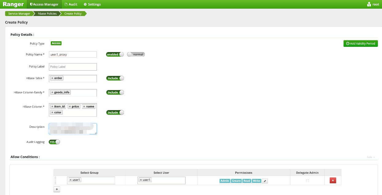 4. After the policy is added, it will take effect in about 30 seconds, then you can use user1 to perform operations on the column family and qualifiers of the order table.