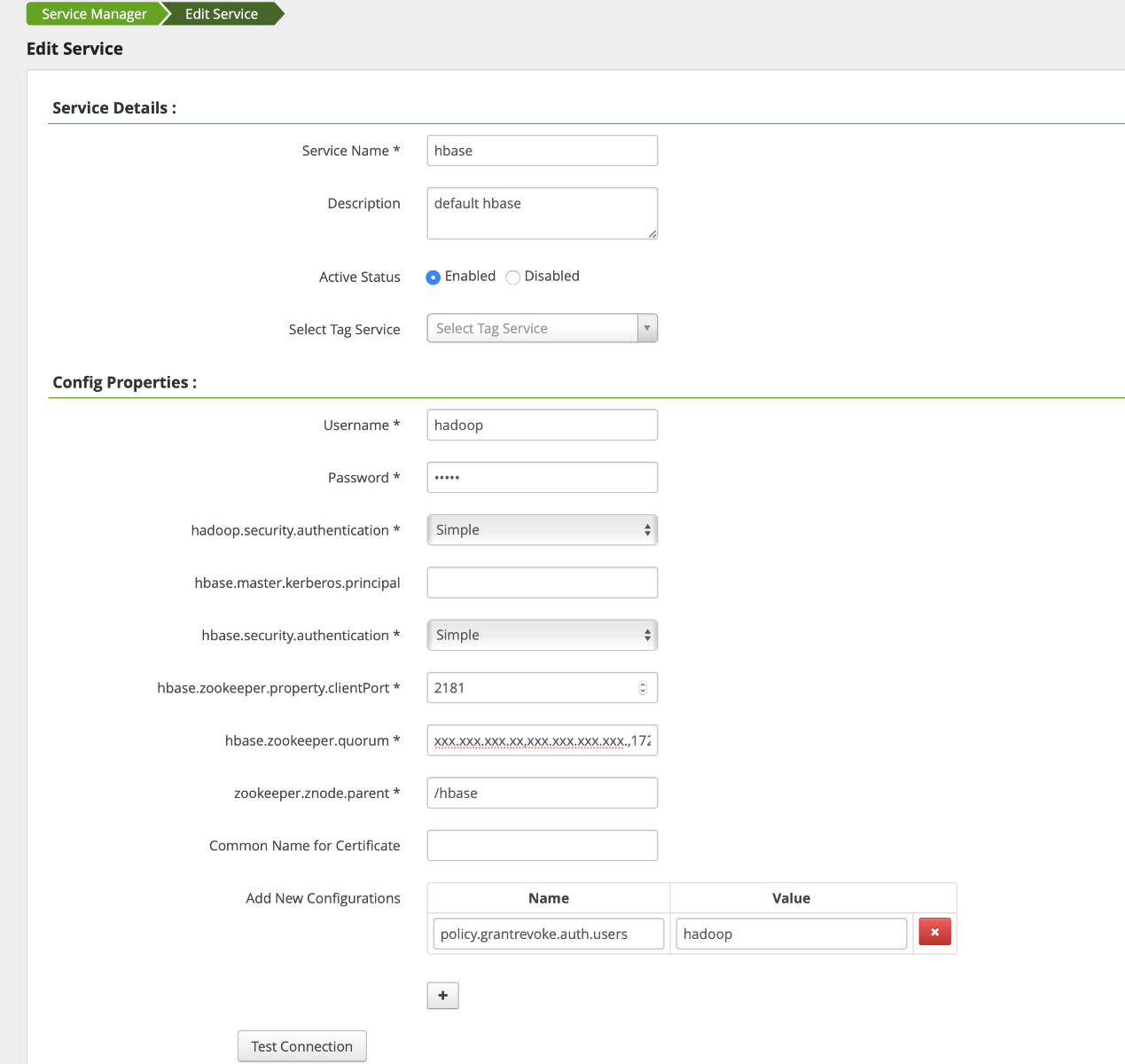 Service Name | Yes | Service name, which is displayed on the main HBase component on the Ranger Web UI |