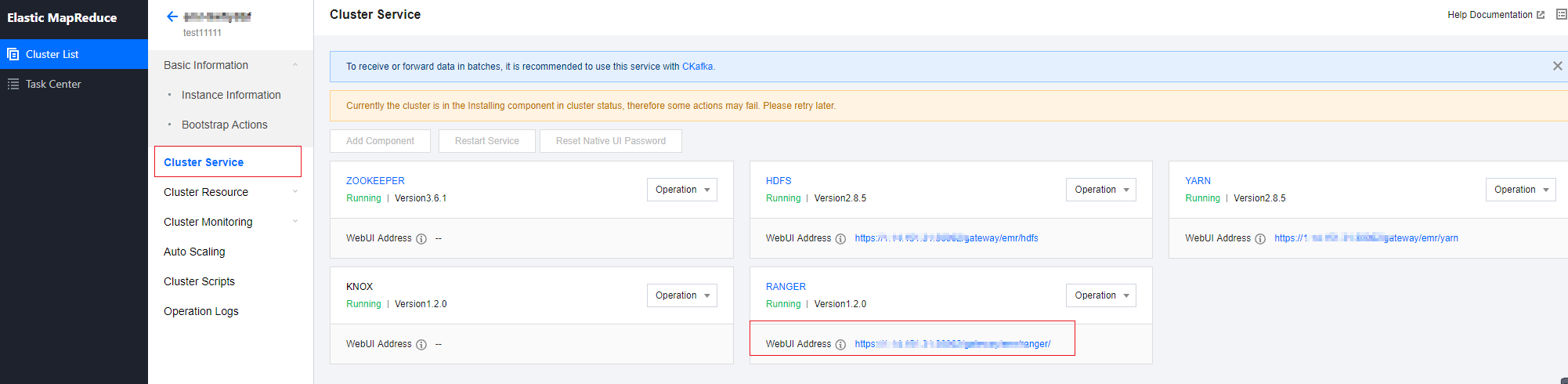 Ranger is available only when it is selected in Optional Components when you purchase a cluster. If you add the Ranger component after purchasing the cluster, the Web UI may be inaccessible. By default, when Ranger is installed, Ranger Admin and Ranger UserSync are deployed on the master node, and Ranger Plugin is deployed on the main daemon node of the embedded component.