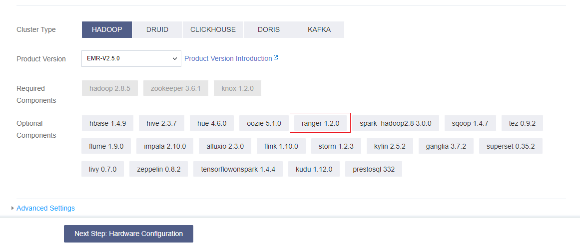 When creating a cluster of the Hadoop type, you can select Ranger in Optional Components. The Ranger version varies depending on the EMR version you choose.